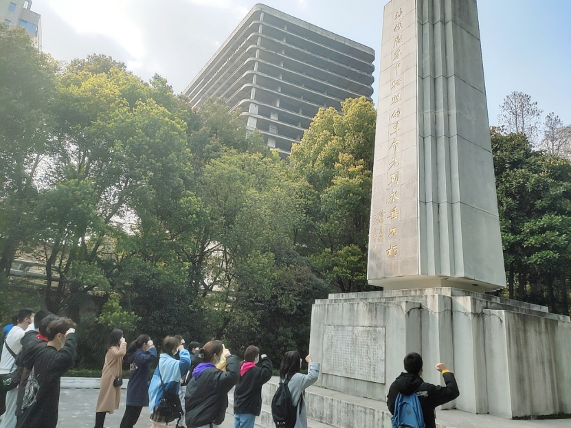 然后,同学们面对着写有“北伐战争中牺牲的革命先烈永垂不朽”的石碑庄严宣誓,展现了强烈的爱国热情。随后,大家静默地为革命先烈献出花朵,虔敬地缅怀英雄。当离开合墓之后,一位同学深切感慨“我想我终于明白‘缅怀革命先烈,追寻红色记忆’的深刻含义与现实意义了”。