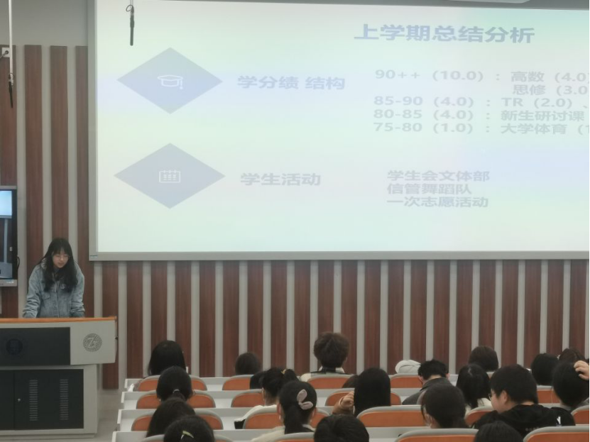 首先是管理科学与工程专业的宋德凤同学进行分享。宋德风同学首先进行的是总结分析,提到各科都要均衡发展。在学习方法上自身要做到三点,第一点是了解差异化竞争,包括认清定位,确立目标;合理学习结构;认清学科间的差异化管理。第二点是任务化管理。第三要做到劳逸结合。关于对未来的展望宋德凤同学提到在学好专业知识的条件下,做好学生工作。