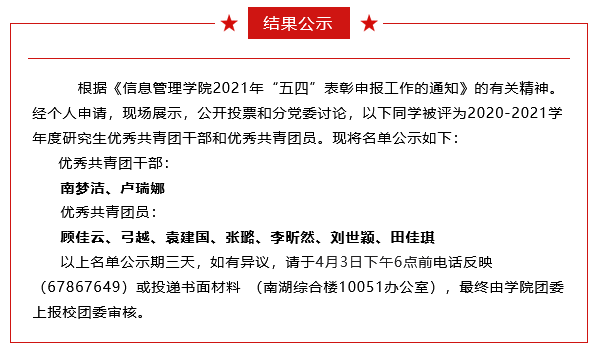 (通讯员 贺满)为进一步营造积极向上的校风学风,增强组织凝聚力,充分发挥优秀团员的模范作用,激励同学对学习工作各方面作出评析与调整。2021年3月30日中午12点,信管学院研究生团总支于南湖综合楼10001会议厅举办“研究生优秀团员团干推优评选大会”,参与本次大会的有各班班长团支书、研会干部、各支部书记以及此次申报同学。