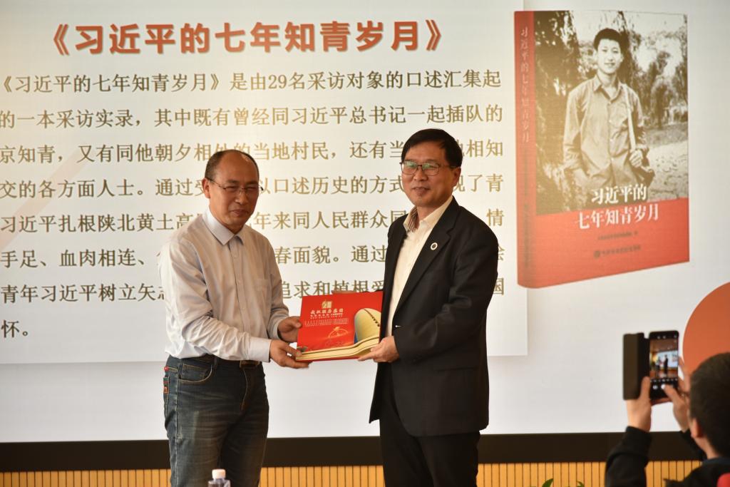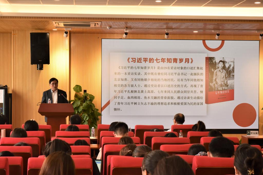 活动开始,任友洲上台领读《习近平的七年知青岁月》。他从本书的教育意义出发,介绍该读物对青年成长的重要意义,其是确立青年人生观、世界观、价值观的重要教材。随后,他向大家介绍青年习近平所处的时代背景——中央号召知识青年上山下乡再教育,以提升青年学生的思想境界。而青年习近平所到达的陕北是插队最艰苦的地方,七年来他扎根黄土高原,同人民群众同甘共苦,树立了矢志不渝的理想追求,培养了爱国为民的家国情怀。