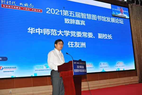华中师范大学党委常委、副校长任友洲,中国信息协会教育分会会长周长春出席开幕式并致辞。中国国家图书馆馆长饶权致辞并作论坛主旨报告。在两天的会期中,各位与会专家学者和参会代表围绕“智慧图书馆建设的顶层思考”“智慧图书馆建设学科视野”等议题展开研讨。