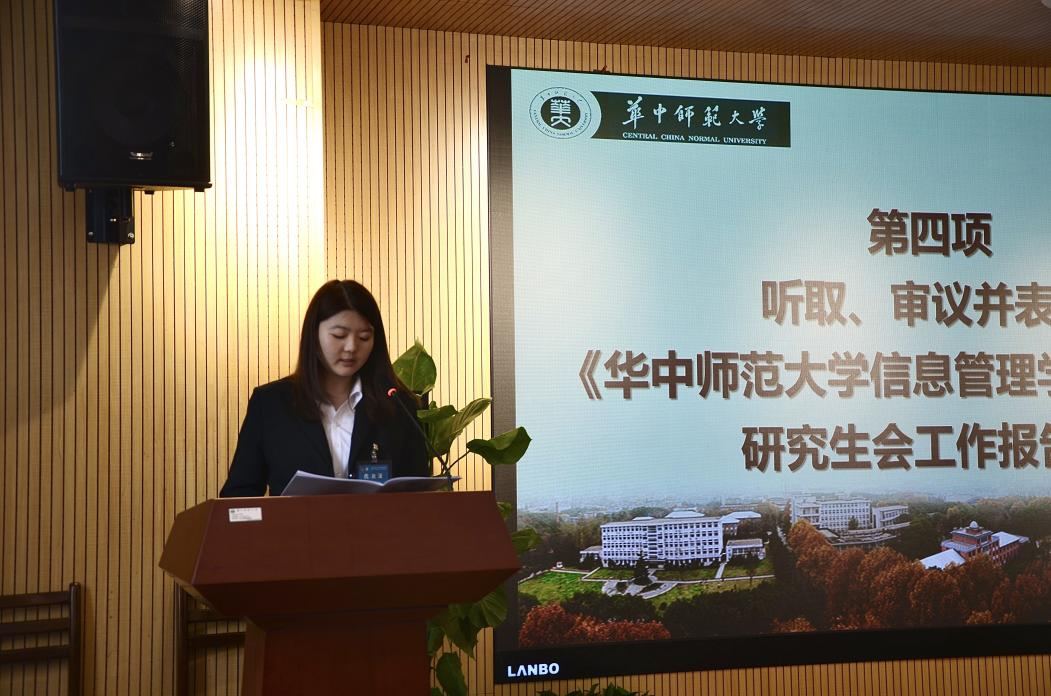 本次大会主要议程分为以下几项:听取、审议并表决《信息管理学院第一次研究生代表大会工作报告》、《华中师范大学信息管理学院研究生会章程报告》、《华中师范大学信息管理学院研究生会章程(草案)》、《华中师范大学信息管理学院第十八届研究生会主席团产生办法》,由我院第18届研究生会主席南梦洁作以上四项报告;由副主席顾佳云作《信息管理学院第一次研究生代表大会代表提案汇总报告》;由团总支李冰洁宣读《华中师范大学信息管理学院第一次研究生代表大会选举工作人员名单》,与会研究生代表对以上内容进行举手表决通过。