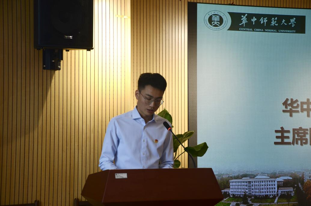 紧接着,华中师范大学研究生会代表陈龚泽祖进行发言。首先陈龚泽祖代表对信息管理学院研究生会在研究生科研以及日常生活中所做的工作表示肯定。信管学院在工作中一直与校研会保持密切联系,树立着良好的合作交流关系。陈龚泽祖希望信管学院研会与校研会在今后的工作中继续加强合作,携手共同营造华中师范大学良好的学风、校风。最后,陈龚泽祖对即将选出的第十八届研究生会主席团表示祝贺,并希望同学们坚定信念,无悔青春,无悔于自己。