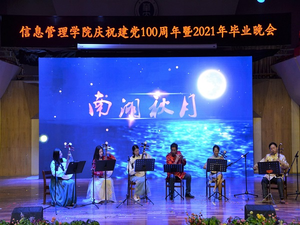 晚会最后,李玉海院长、娄策群教授、杨小溪老师以及阮艺协会,用中华传统乐器合奏《南湖送别》、《送别》等曲目,音乐悠扬缠绵,让人身临其境。演奏中浓厚的历史文化与真切的教育力量引导着毕业生们传承信管文化,接续爱国篇章。