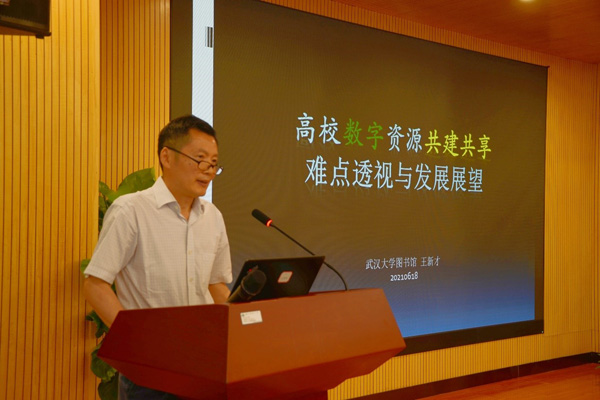 继而,王新才馆长作了《高校数字资源共建共享难点透视与发展展望》主题报告,向与会代表介绍了湖北省高校数字资源建设情况,深入分析了高校图书馆共建共享面临的核心难题,并对未来的发展思路进行了展望。
