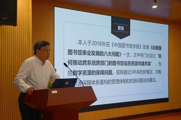 之后,叶继元教授作了《全国数字资源保障体系重构的管理体制与机制宏观构想》主题报告,从数字资源保障体系管理体制与机制现状入手,分析了当前存在的存在问题,并系统阐述了全国数字资源保障体系重构的管理体制和机制设计构想。