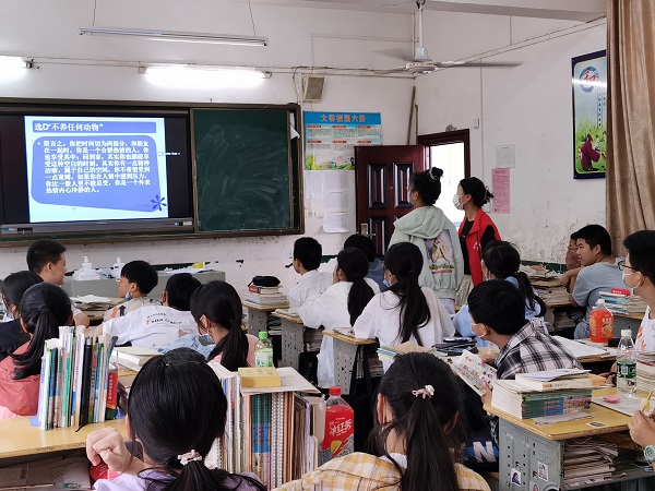 准时到达长岭中学后,志愿者立即前往教室与学生们见面并开始上课。首先是志愿者周艳带领学生们进行人际心理测试。该项测试要求学生们在四个选项中选出自己最想养的宠物,四个选项分别是狼犬、波斯猫、变色龙和不养任何宠物。这四个选项分别代表了一种类型的人格,例如对选择波斯猫的同学来说,平时给人的印象是温和的,但内心刚强,有自己不易动摇的原则,属于“外柔内刚”这种类型的人格。通过对这个题目做出选择,学生们可以在一定程度上了解到自己可能的性格特点。