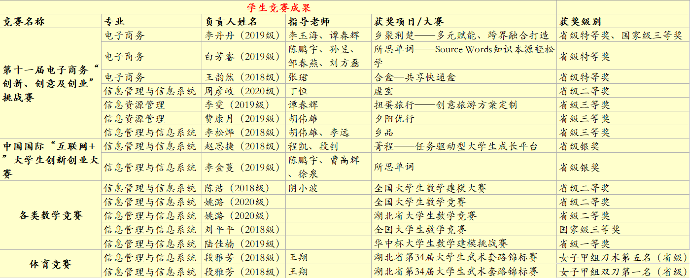 在各类学生竞赛方面,有10支学生团队在创新创业大赛中获得国家级、省级奖项。有4名学生在数学竞赛获得国家级、省级奖项,有1名学生在湖北省体育竞赛中获得2次奖项。