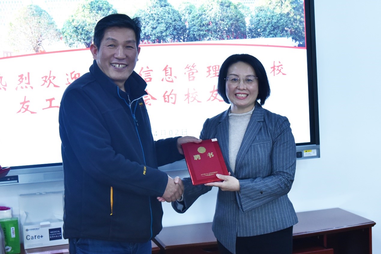 李玉海为各位校友颁发“校友大使”聘书,加强校友和信息管理学院之间的联系,增进友谊,加强团结,增强学院的凝聚力。