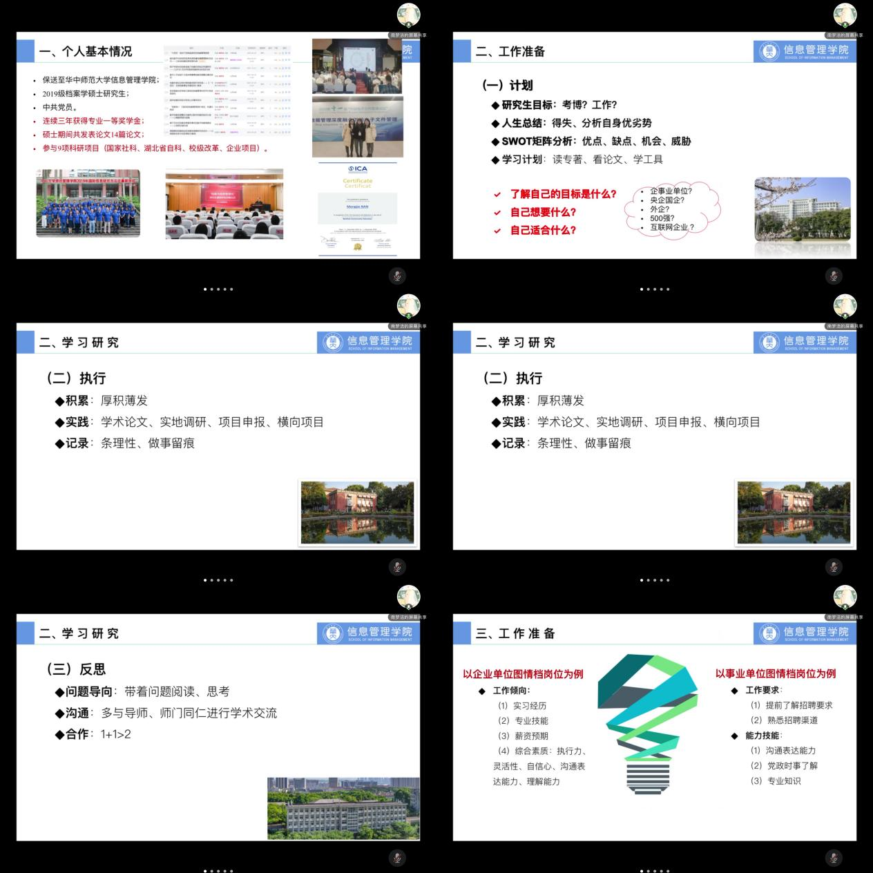 本次的优秀学长学姐经验分享会向2022级新生们传授了宝贵的学习经验和就业方向指导,期待2022级同学们能在此次分享会中能够有所收获,明确研究生阶段学习的目标,并照着目标坚定不移地走下去。至此,2022级信息管理学院硕士研究生第四次新生教育系列活动圆满结束。
