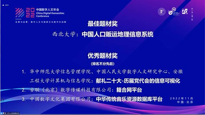 年会还面向全球征集评选出2022年中国数字人文年会优秀项目(以华语或中国研究为主题)共26项。由我院博士研究生张强主持开发的“献礼二十大-历届党代会的信息可视化”荣获“2022年中国数字人文年会优秀题材奖”。此外,本次大会还单独另设了最具人气项目奖,由中国人民大学信息资源管理学院一级教授冯惠玲颁奖,“献礼二十大-历届党代会的信息可视化”项目积极参与,在学院王雨露书记的大力指导和宣传下,从26个展示项目中脱颖而出,成功获得“2022年中国数字人文年会最具人气项目奖”。
