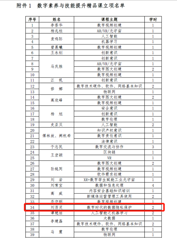 (通讯员 张梦雨)为深入贯彻落实习近平总书记重要指示精神,全面推进《提升全民数字素养与技能行动纲要》实施,提升各类劳动者数字素养与技能,建设好中国电子劳动学会数字素养与技能提升人才培养工程,中国电子劳动学会决定面向各高等院校、企业和有关单位征集“数字素养与技能提升精品课程”。其中,我院刘百灵教授主持的课程《数字时代的数据隐私保护》获得立项,在此,谨向刘百灵老师表示祝贺!信息管理学院历来非常重视课堂教学与课堂建设,开展了教学大讲堂、课程思政等一系列课程建设内容。