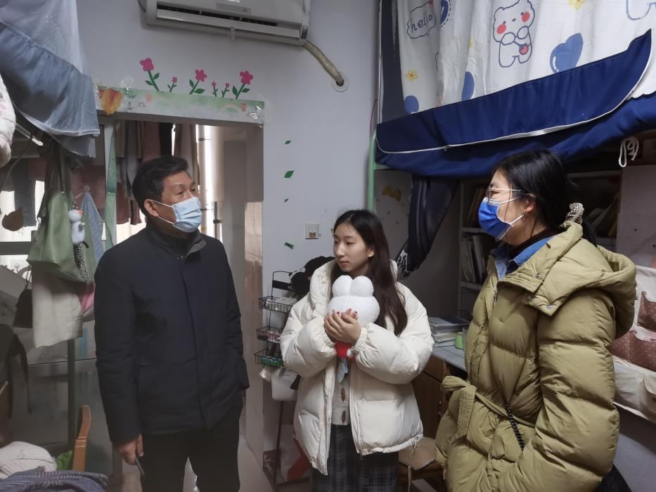 李玉海一行深入走访留校学生,院长李玉海、副书记王涛关心同学们的学习生活状况,了解留校原因及家庭状况,鼓励大家把握好寒假留校时间,积极充实自我,安心开展学习工作。李院长嘱托留校大四学生制定详细的寒假规划,如在知悉考研初试成绩后,理性规划发展方向,做好考研升学、实习就业等多项准备工作,并尽早完成毕业论文,鼓励研究生同学在新的一年里科研学习上不断进取,增强本领,提升科研素养,规划好未来学术科研计划,利用好寒假留校时间,劳逸结合地开展日常学习工作,思考发展道路,笃行不怠,并建议学生值此新春佳节,多联系关心父母。他提醒学生注意学校宿舍生活的安全事项,合理作息。遇到问题及困难及时与辅导员、导师和家长联系,学院会全力为同学们排忧解难。