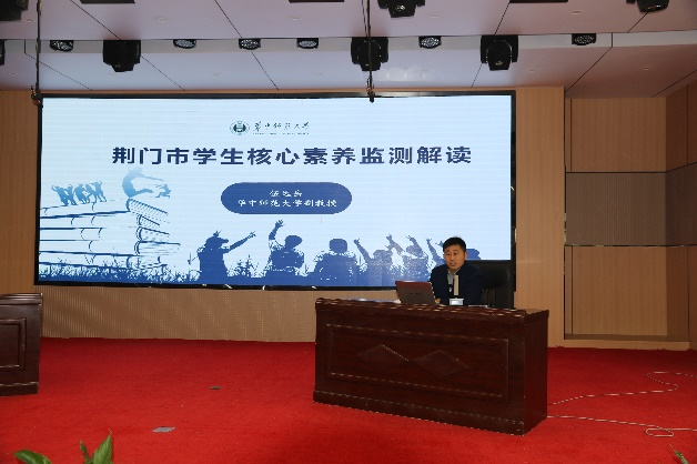 会议第二阶段,华中师范大学专家团队对2022年荆门市义务教育质量监测结果进行解读。华中师范大学教育学院郭元祥教授作为本次荆门市义务教育质量监测工作的首席指导专家,对荆门市核心素养监测总体情况进行结果解读。随后,华中师范大学教育学院伍远岳副教授、数学与统计学学院胡典顺教授、生命科学学院李娟副教授、文学院陈秀玲副教授分别针对一般核心素养、数学核心素养、科学核心素养、阅读核心素养作监测结果解读。