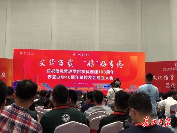 2023年5月2日,《长江日报》公众号刊发文章《华师信息管理学院校友会成立》,《人民日报》转载,对我院学科创建103周年、恢复办学40周年暨校友会成立大会进行了报道,现将全文转载如下:
