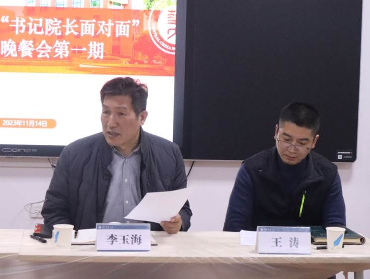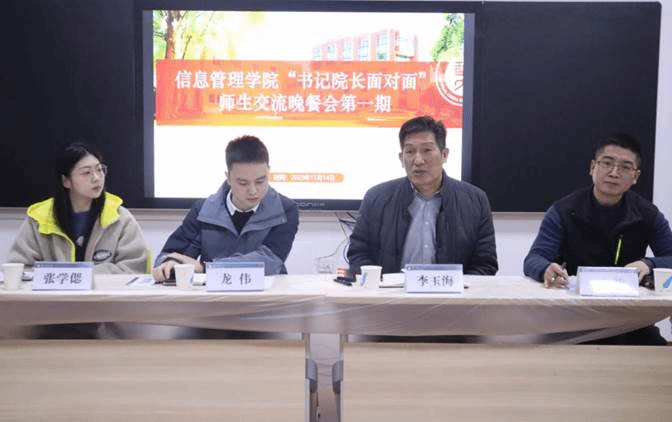 (通讯员:欧龄鸿 毛宛婷)为促进学院教育教学改革和发展,增强师生沟通,信息管理学院于11月14日下午在南湖综合楼10006会议室举行“书记院长面对面”师生交流晚餐会第一期活动。本次活动由研究生辅导员龙伟主持,信息管理学院院长李玉海、信息管理学院党委副书记王涛、研究生辅导员张学偲以及信息管理学院数位同学参与本次活动。