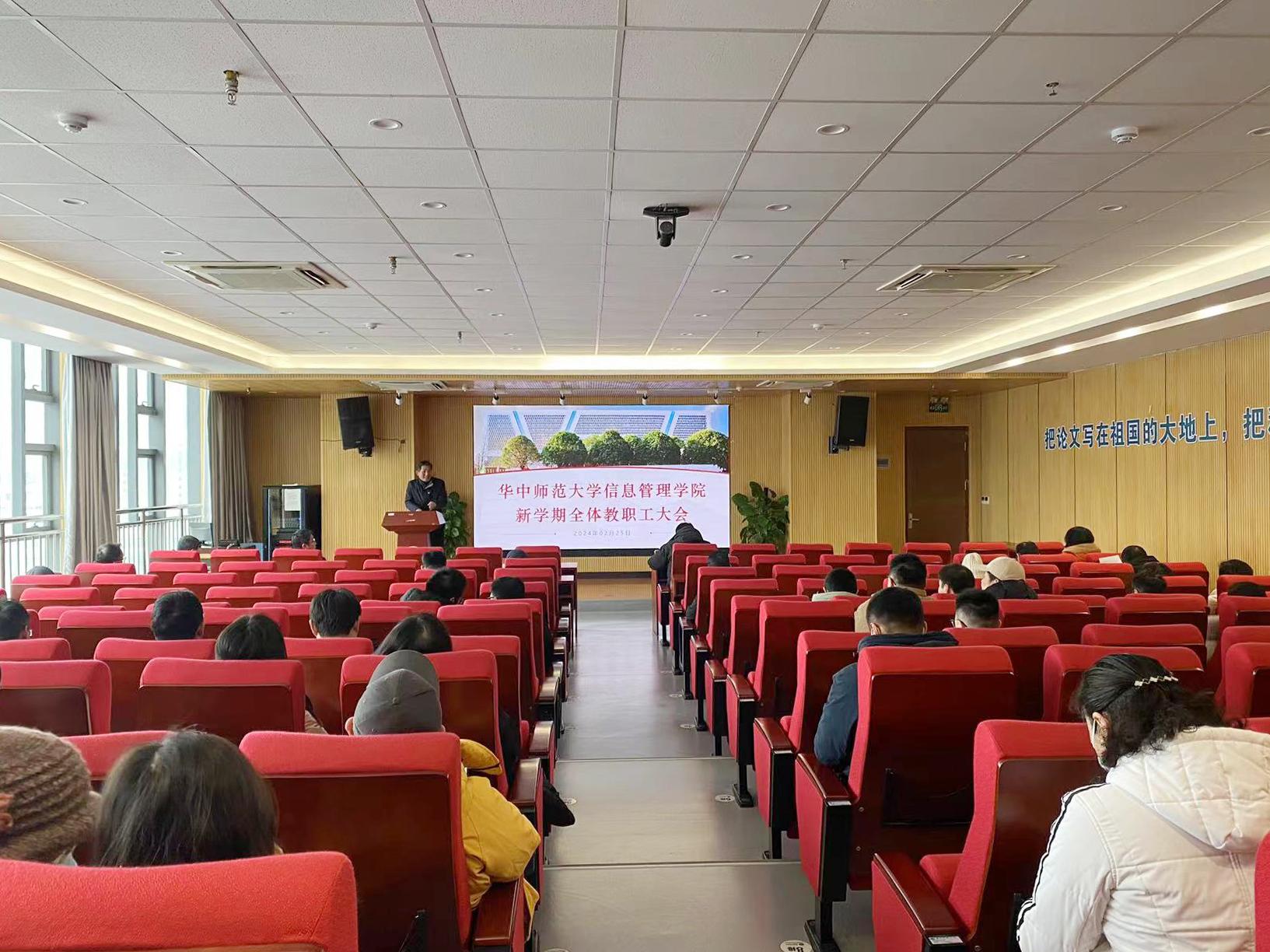(通讯员 龙伟)2月25日下午,信息管理学院新学期第一次全体教职工会议在南湖综合楼10001报告厅召开,学院党政班子成员和全体教职工参加了会议,会议由院长李玉海主持,分三个阶段进行。