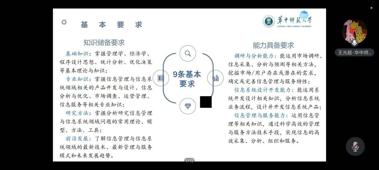 王光超从专业基本情况、专业特色、专业前景三个方面对信息管理与信息系统专业进行介绍。王光超指出,信息管理与信息系统专业是由信息、情报、大数据这三大要素组成,涵盖了管理科学和信息技术两大维度,旨在培养厚基础、高素质、强能力的复合型、应用型高级专门人才。他从创立时间、师资力量、获奖情况等详细介绍了专业基本情况,并介绍了课程设置情况,用历年来学生就业数据分析了专业就业前景。