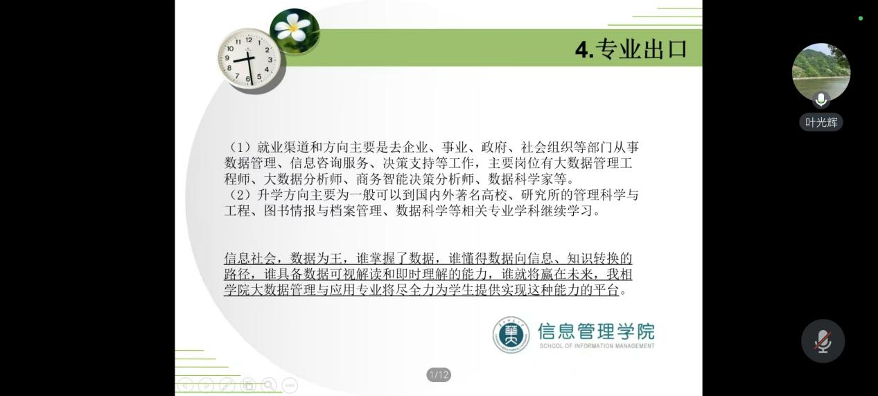 叶光辉从专业建设基本情况、专业课程设置、专业能力考核、专业出口四个方面对大数据管理与应用专业进介绍。叶光辉指出,我院从2021年3月成立大数据,成立初衷即为负责大数据管理与应用专业课程建设与实习实训工作。他提到,本专业学生的能力发展有对数据敏感、助数据说话、让数据说话、对数据敬畏几个阶段,并用20级首届毕业生的就业情况向同学们分析了就业前景。