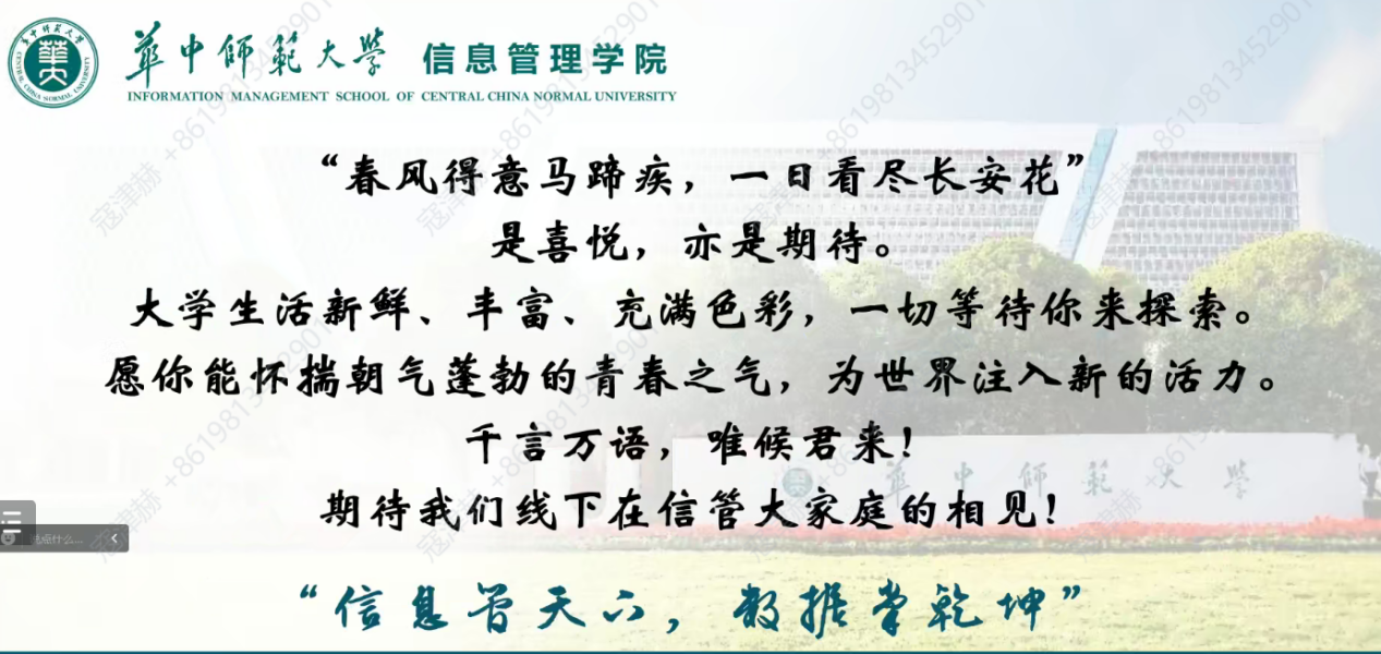 (通讯员 寇津赫)为增强家校之间的沟通,构建协同育人的有效机制,帮助新生适应大学生活,华中师范大学信息管理学院于2024年8月25日召开2024级本科新生及家长线上见面会。院党委副书记王涛出席本次见面会,2024级专职辅导员蒋可鸣、兼职辅导员张巍瀚和2024级新生及其家长参与会议。