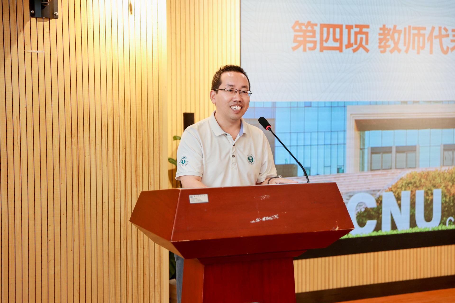 教师代表谭春辉致辞。他向同学们表示热烈欢迎和诚挚祝贺,期待与大家共同开启新篇章,并鼓励同学们主动寻求学习资源,同时要体验多维的研究生生活,在学习和科研之余多参加社团活动、社会实践,希望同学们不断超越自我,实现自己的梦想与价值。