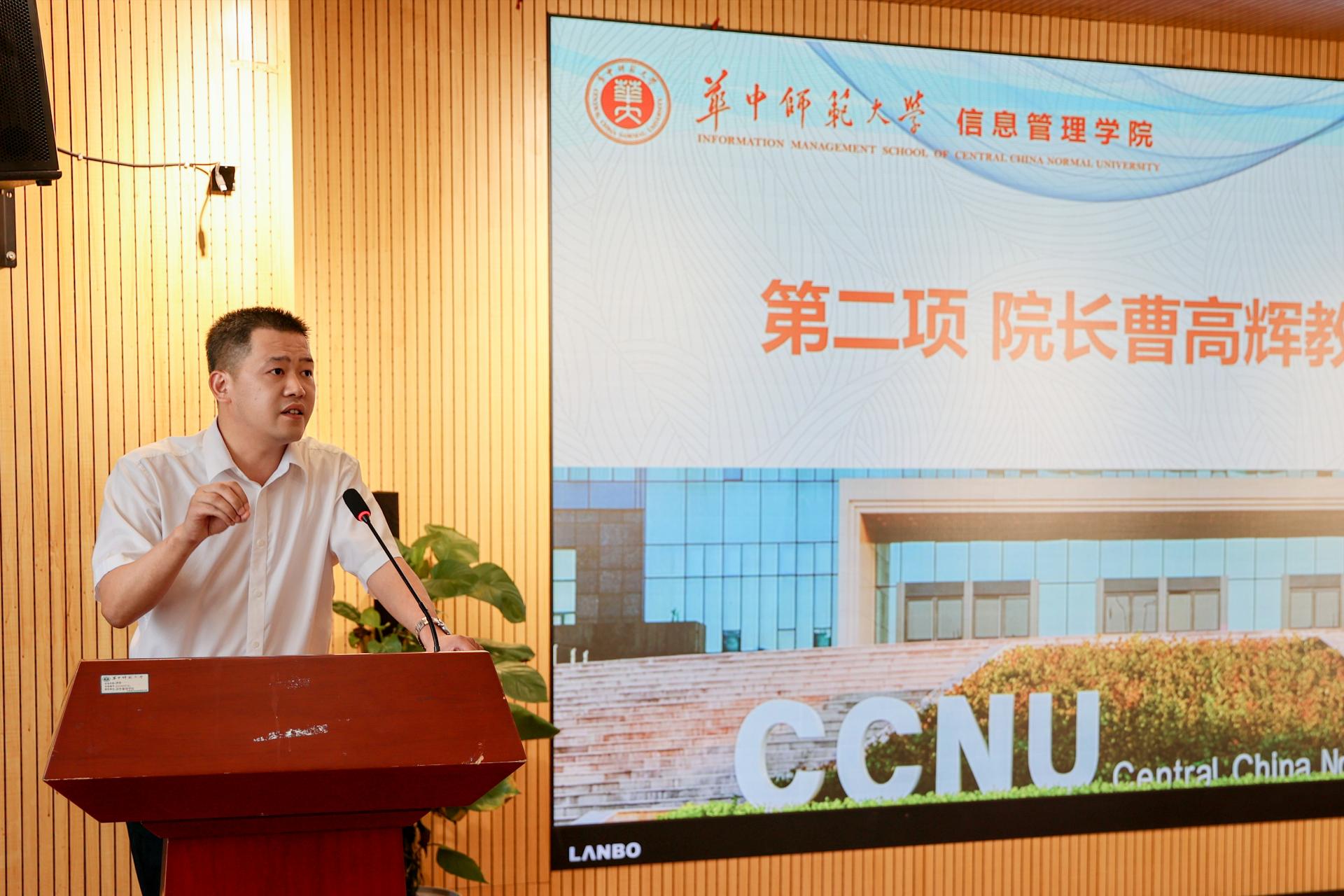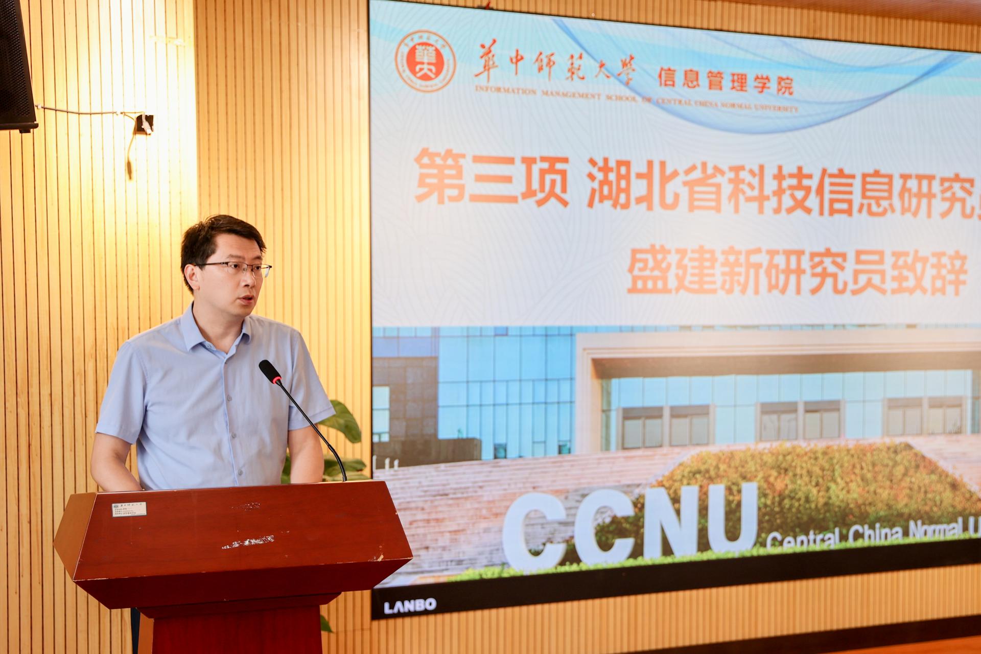 湖北省科技信息研究院副院长研究员、湖北省信息学会常务副理事长盛建新致辞。他向全体新生表示祝贺,并详细介绍了湖北省科技信息研究院的发展历史、功能定位、队伍建设、成就贡献等基本情况。他表示,在未来将与我院在项目申报、课题合作、平台建设、人才培养等方面加强合作,促进双方共同发展。最后,他向同学们未来的学习生活表达了美好祝愿。