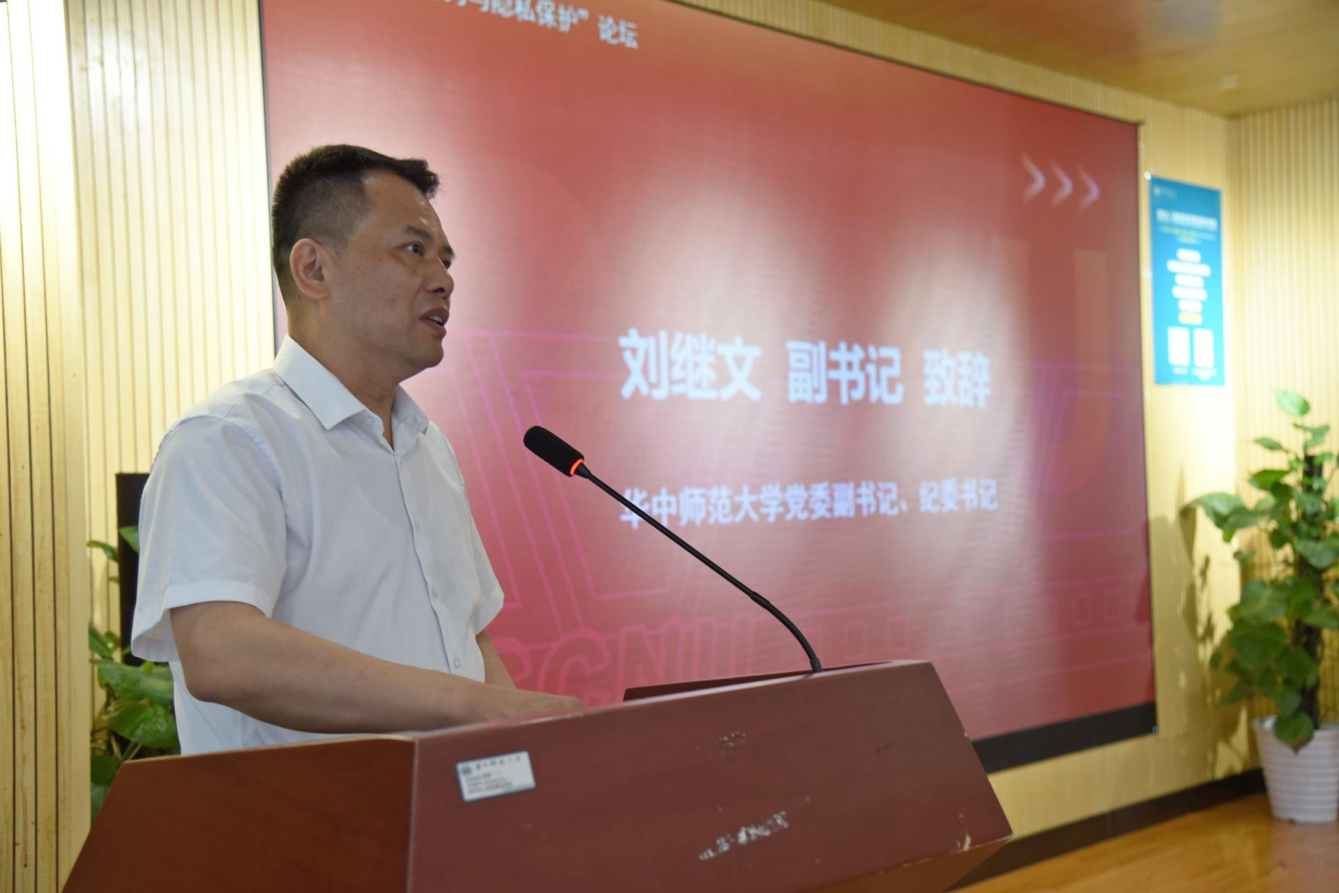 刘继文副书记致辞。他简要介绍了学校悠久的办学历史,作为综合性的师范大学,华中师范大学积极抢抓教育强国、教育数字化转型、教育优先发展、教师教育振兴等机遇,全面推进学校高质量发展。同时信息管理学院作为学校双一流学科建设重点培养单位,学校和学院充分发挥信息资源管理和管理科学与工程两个一级学科交叉融合优势,成立了多学科交叉的信息交互行为与隐私保护的优秀青年团队。最后他希望各位专家学者能够以本次论坛为平台,通过充分的学术交流和思想碰撞,提出更多建设性的建议,产出更多的研究成果,共同推动我国数字化建设迈向新高度。