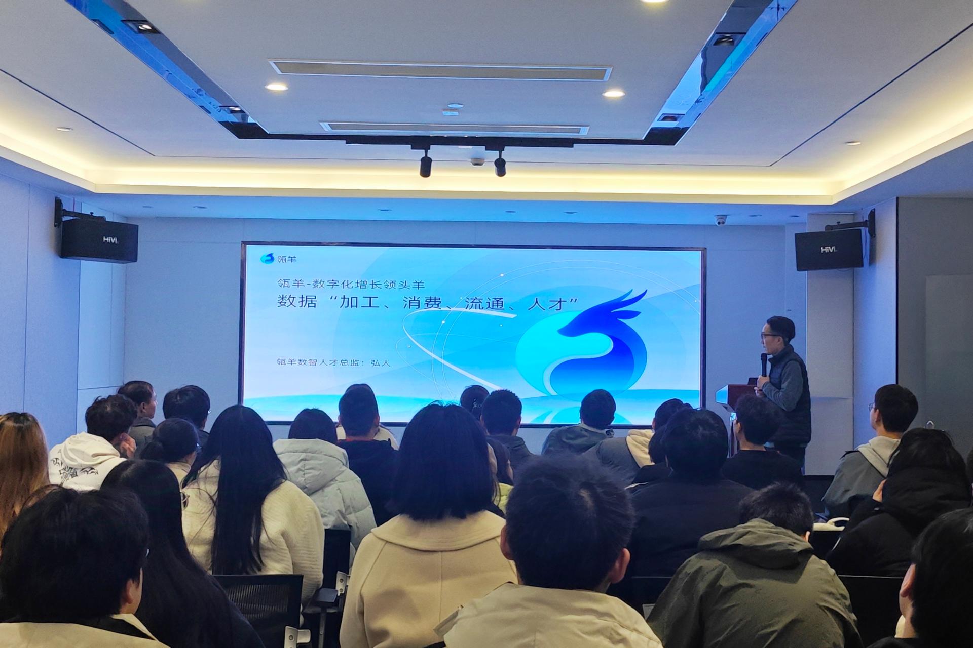 12月7日上午,本次专业认知实践首站来到瓴羊智能科技有限公司(阿里巴巴)和慕研(杭州)数据分析。瓴羊数智人才总监许长宾以“数据‘加工、消费、流通、人才’”为主题,从公司简介、产品服务、人才培养等方面展开分享。他介绍道,瓴羊数智集数据、业务、服务中台为一体,在阿里巴巴集团生态体系中发挥重要作用,同时围绕瓴羊DaaS核心要素并结合丰富案例,展现瓴羊体系化的的产品与服务链。