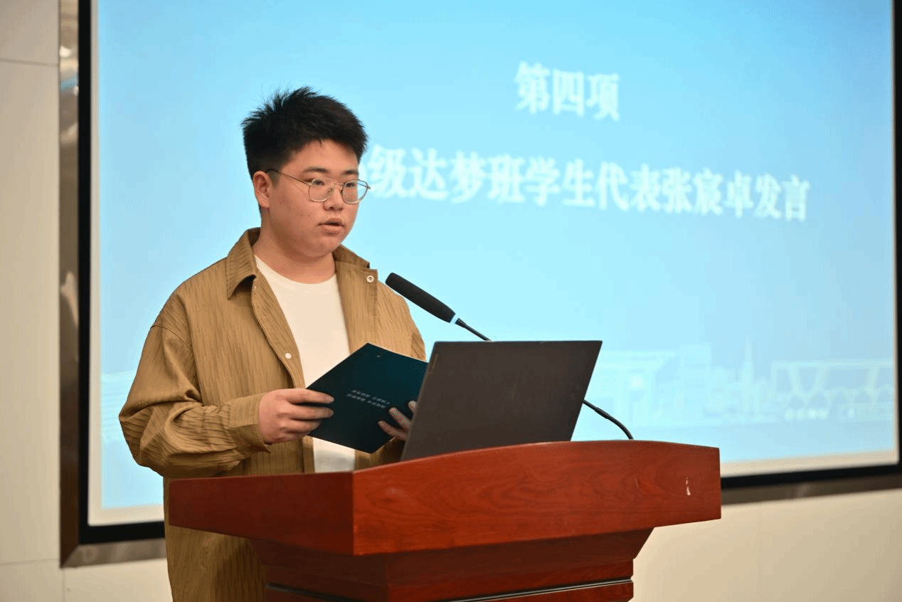 2025级新生代表张宸卓登台发言,他谈到,达梦班为同学们搭建了理论与实践衔接的桥梁,助力大家对接产业前沿、提升专业能力。作为班长,他承诺将带领同学们扎实学识、紧跟技术前沿、勇于担当作为,以优异成绩回报学校与企业的培养,努力成长为高素质数据科学人才。