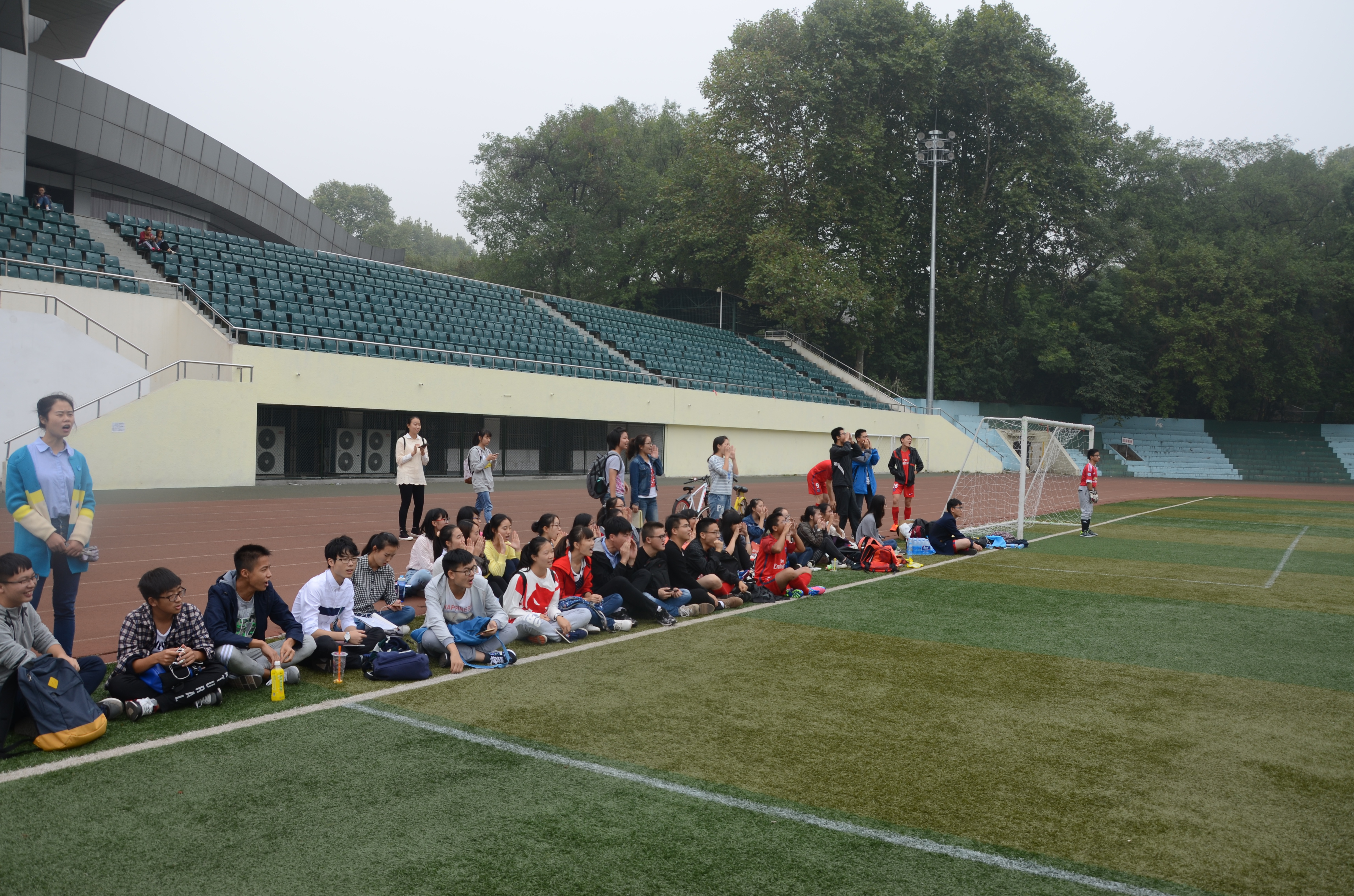 上半场时间过去一半,白方门将踢大脚球,红方队长徐港截球往白方场地踢,中途被白方10号截球,白方十号把球逼近红方球门,险些进球,球出了红方底线,红方四号踢大脚球,战场又转移到白方场地,为红方十号踢进球做了好的准备。不仅赛场上热闹,双方的啦啦队更是不甘示弱,喊出了震耳欲聋的声音为自己球队加油,这更增添了球场上的热烈与激情,在加油声中,上半场结束,红方暂时领先一分。