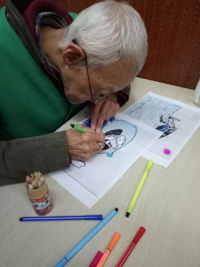 第三部分是志愿者结合ppt上的具体画面内容为残疾人朋友讲述了一个生动的故事,并且在讲故事的过程中为残疾人朋友发放需要涂色的图纸和涂色工具,让各位残疾人朋友在听志愿者讲述故事的同时,用自己的想象力来给空白的图纸涂上绚丽的色彩。而在整个涂色的过程中,志愿者们分散开来,积极的回应每一个残疾人朋友的问题。志愿者们用自己的耐心一步步地教会残疾人朋友如何涂色,并且对他们的作品给予高度的称赞,从而激发了残疾人朋友对涂色也有了更大的积极性。
