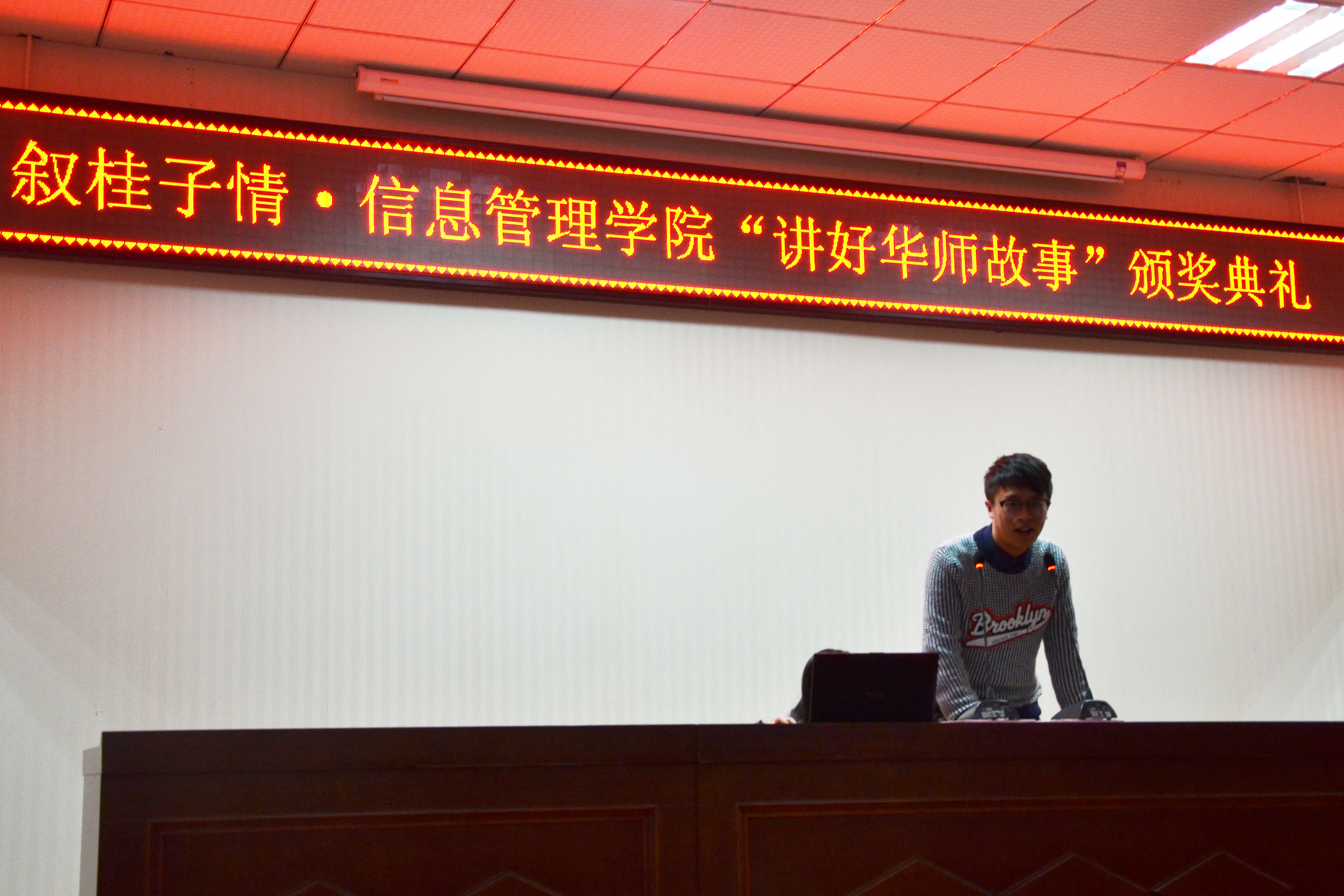 ,信息管理学院2016年度的“讲好华师故事”比赛暨学院优秀团体及个人颁奖典礼于大学生活动中心403教室进行。本次活动旨在鼓励新老师生讲述自己在华师经历的点点滴滴,表达对信管学院的美好情感;增进同学们对华师的喜爱和对信管学院的归属感。本次颁奖典礼特邀信息管理学院团委书记蒋可鸣与16级辅导员穆帆老师为嘉宾。