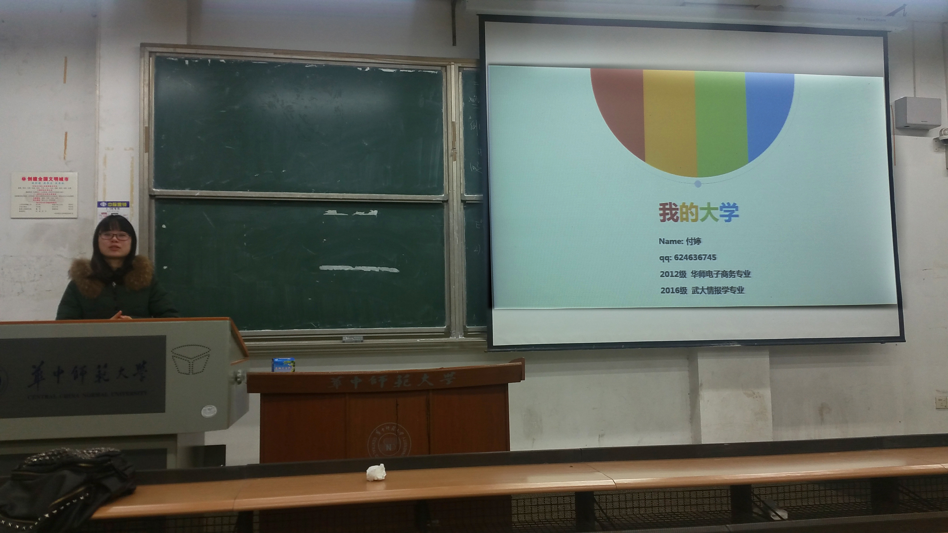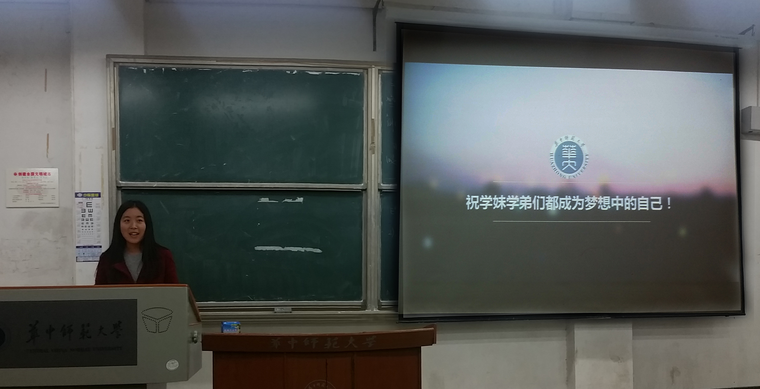 第二位向大家分享的是现就读于武汉大学情报学的付婷学姐。付婷学姐以“我的大学”为主题,先后向同学们介绍了自己的大学四年的旅程,可以提升的技能、原则板块以及考研的经验过程。付婷学姐告诉同学们,要尽早的定下之后的目标,是保研、考研,还是就业,并且之后向着目标去努力。付婷学姐还说,考研是一段非常艰辛的路,竞争非常大,同学们要早点备考。