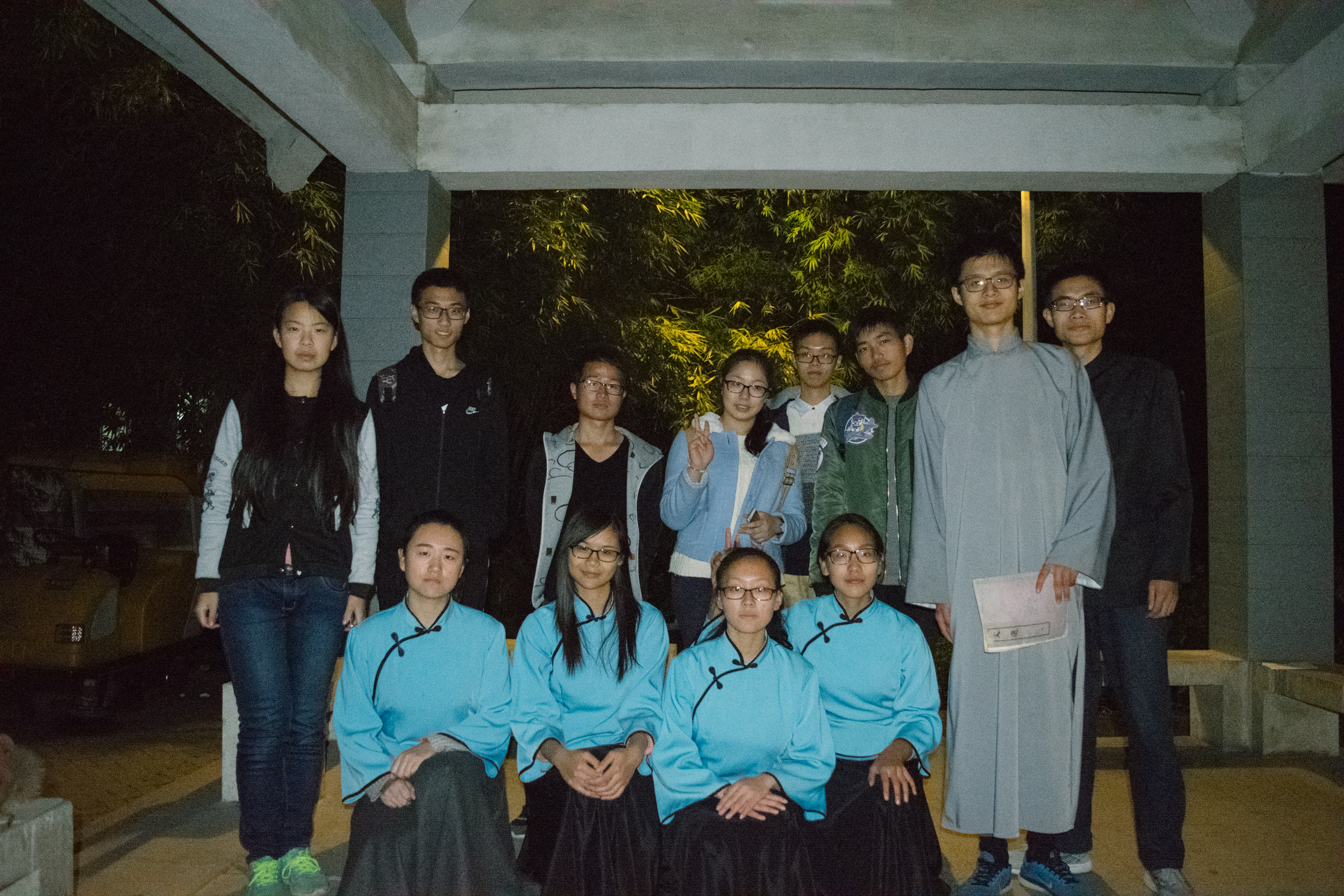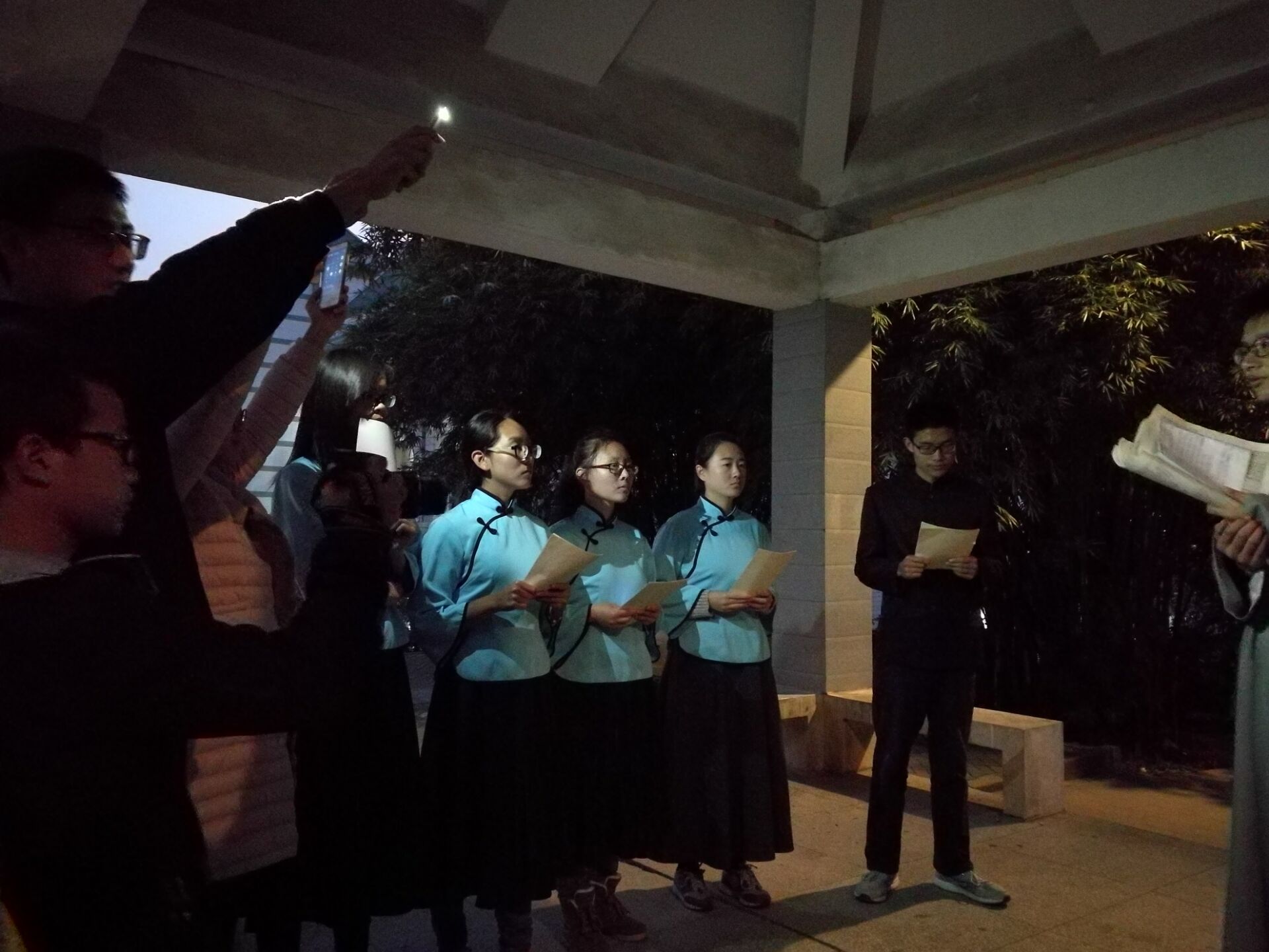 下午16点左右,第三幕完成拍摄,同学们转移至西区宿舍楼下拍摄第一幕《代英授课》。此时,负责后勤的同学已去历史学院借来桌椅,搭建好了剧中的民国教室的场景。为了提高场景的逼真度,同学们还去图书馆借来了旧图书。第一幕的拍摄用时近一个小时。接着,同学们又赶往牡丹亭拍摄第二幕《五四潮涌》。此时,天色已晚,光线不足导致拍摄难以完成。同学们打开了手机上的电筒照明,使拍摄顺利地进行下去了。