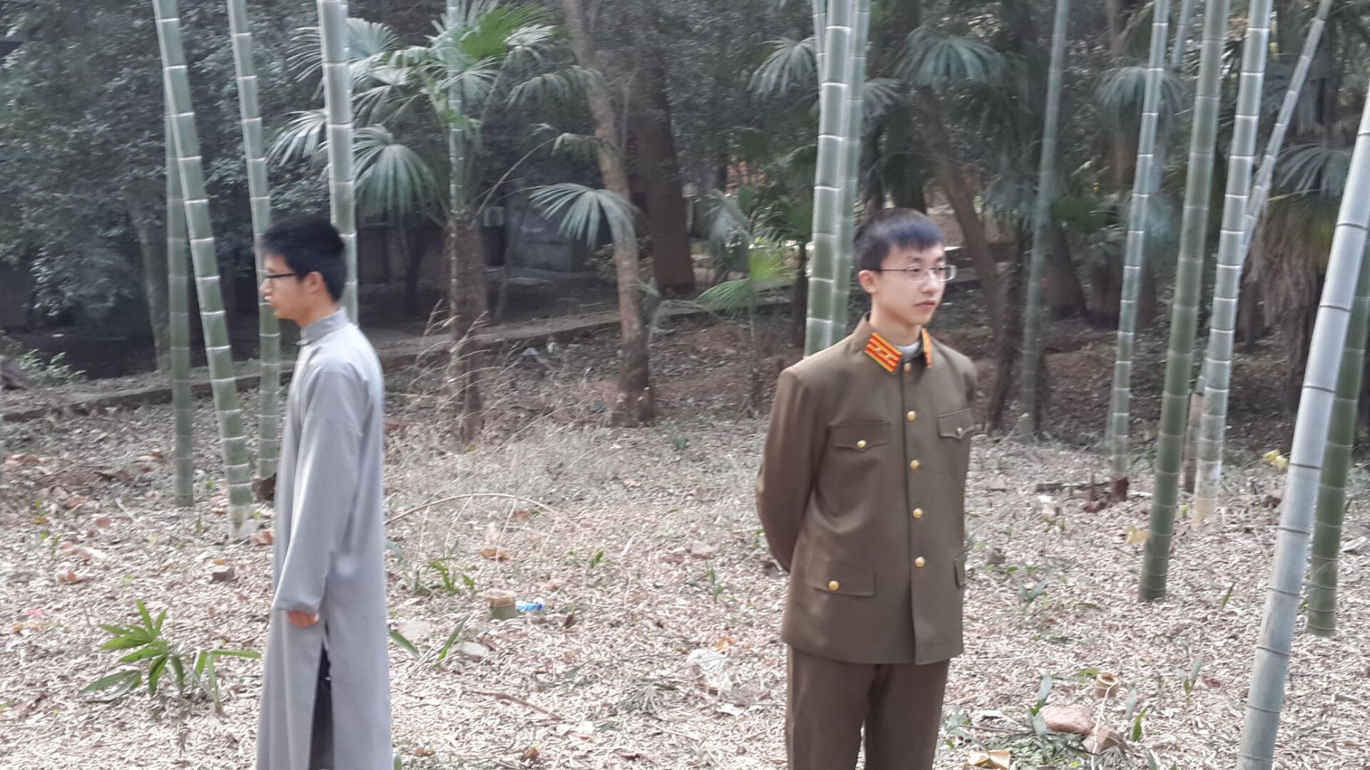 下午14点10分,1601班全体学生于博雅广场集合完毕,此外,还有信息管理学院年级组织部的姚玉佳、于啸天到场进行指导。1601班团支书胡瑞祥为剧中演员领取来服装,同学们换好服装后,一齐前往拍摄场地——桂苑宾馆背后的一片竹林。考虑到同学们的时间问题,首先拍摄的是第三幕《狱中就义》。恽代英的扮演者张驰和顾顺章的扮演者徐虎于竹林某处摆出对峙姿势,胡瑞祥手持单反进行拍摄。拍摄过程中,演员们台词、动作、神态力求做到最大限度地还原剧本。演员们时有笑场或失误,惹得现场欢笑一片。同时,等戏的同学也在积极背诵台词,讨论表演细节。
