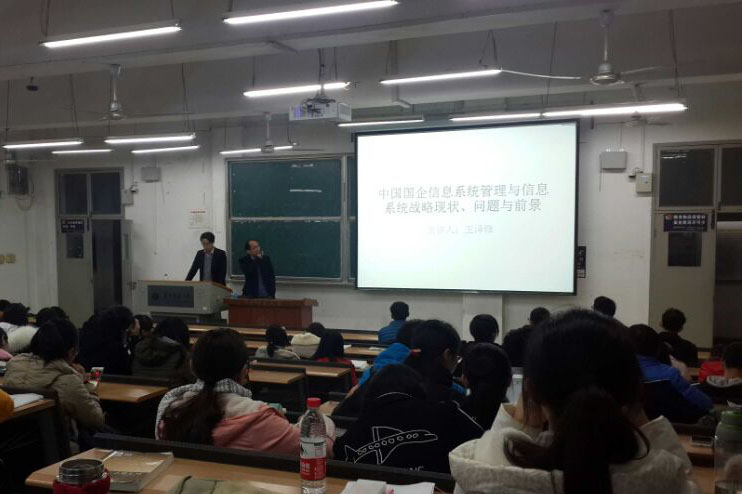 首先,王泽锋老师从中国国企信息系统管理与信息系统的战略现状、问题与前景三个部分对课题进行了细致的讲解。他从信息管理系统的内涵、课程设置、个人经历、社会背景、国家政策、发展前景、存在困难等诸多方面对信息系统管理与信息系统专业进行了专业分析,加深了同学们对本专业的理解。之后,王泽锋老师又以企业为切入点,细致讲解了信息系统管理与信息系统专业的具体应用,结合了企业组织、文化、战略等要素,让同学们对该专业及其就业的认识更加形象。