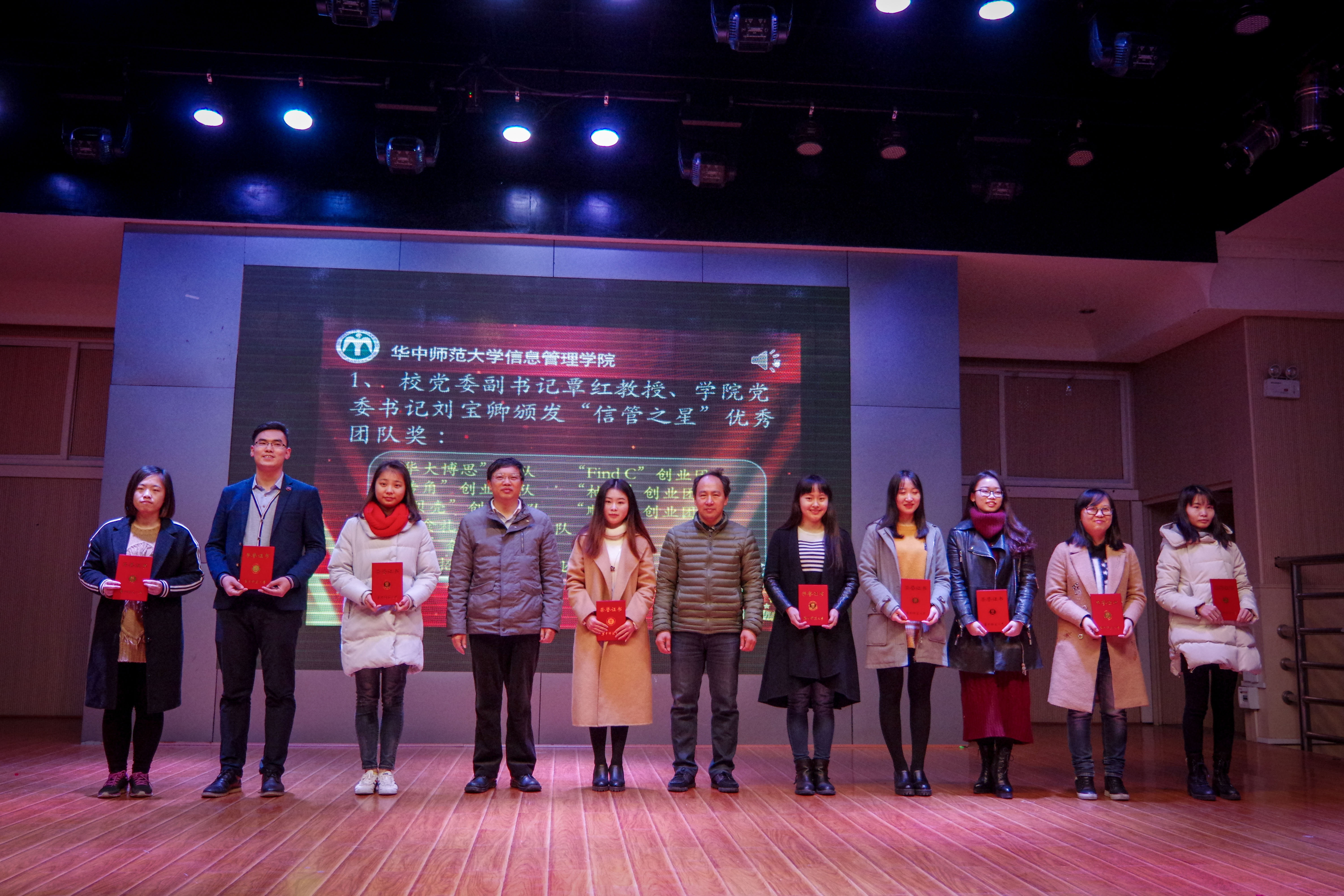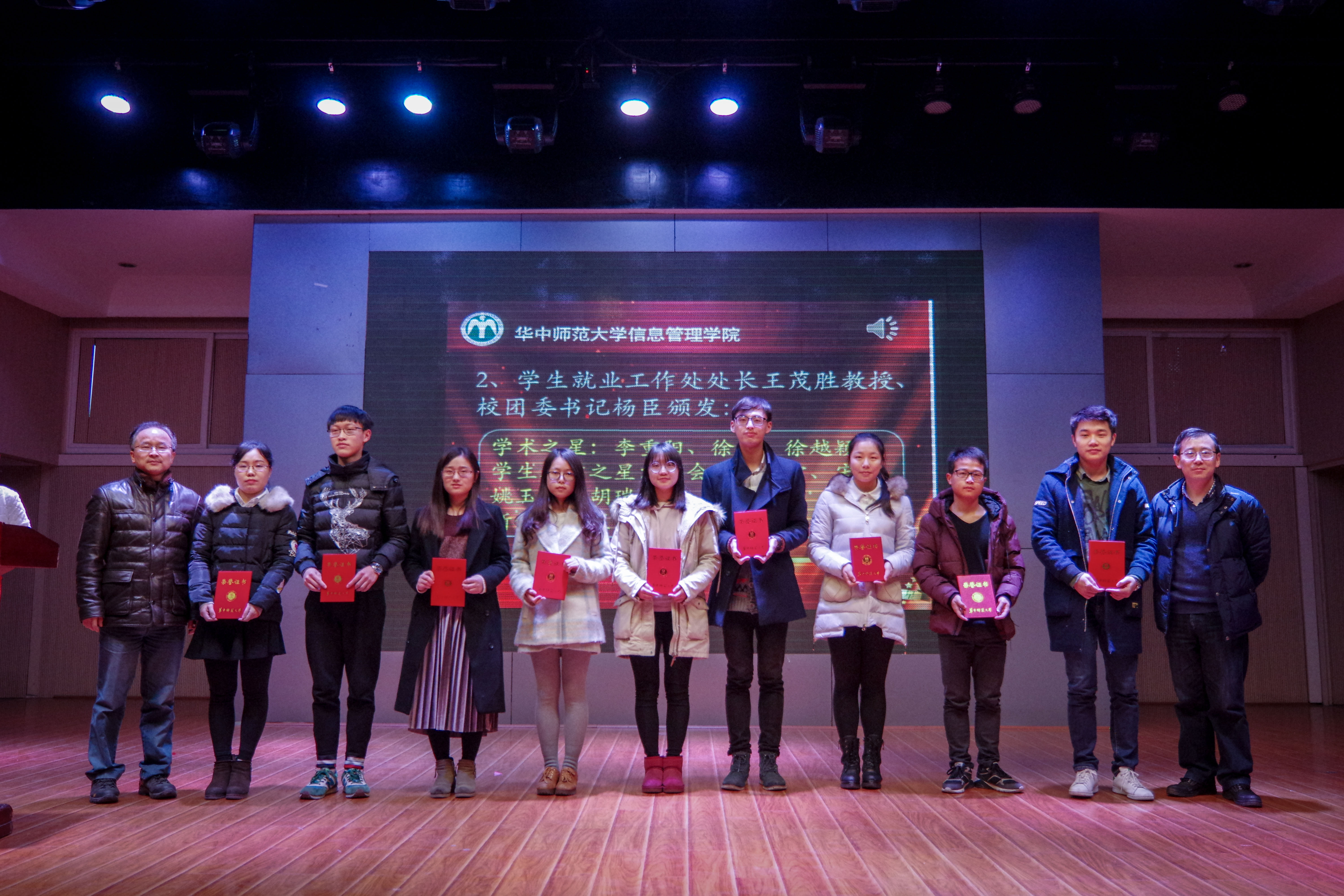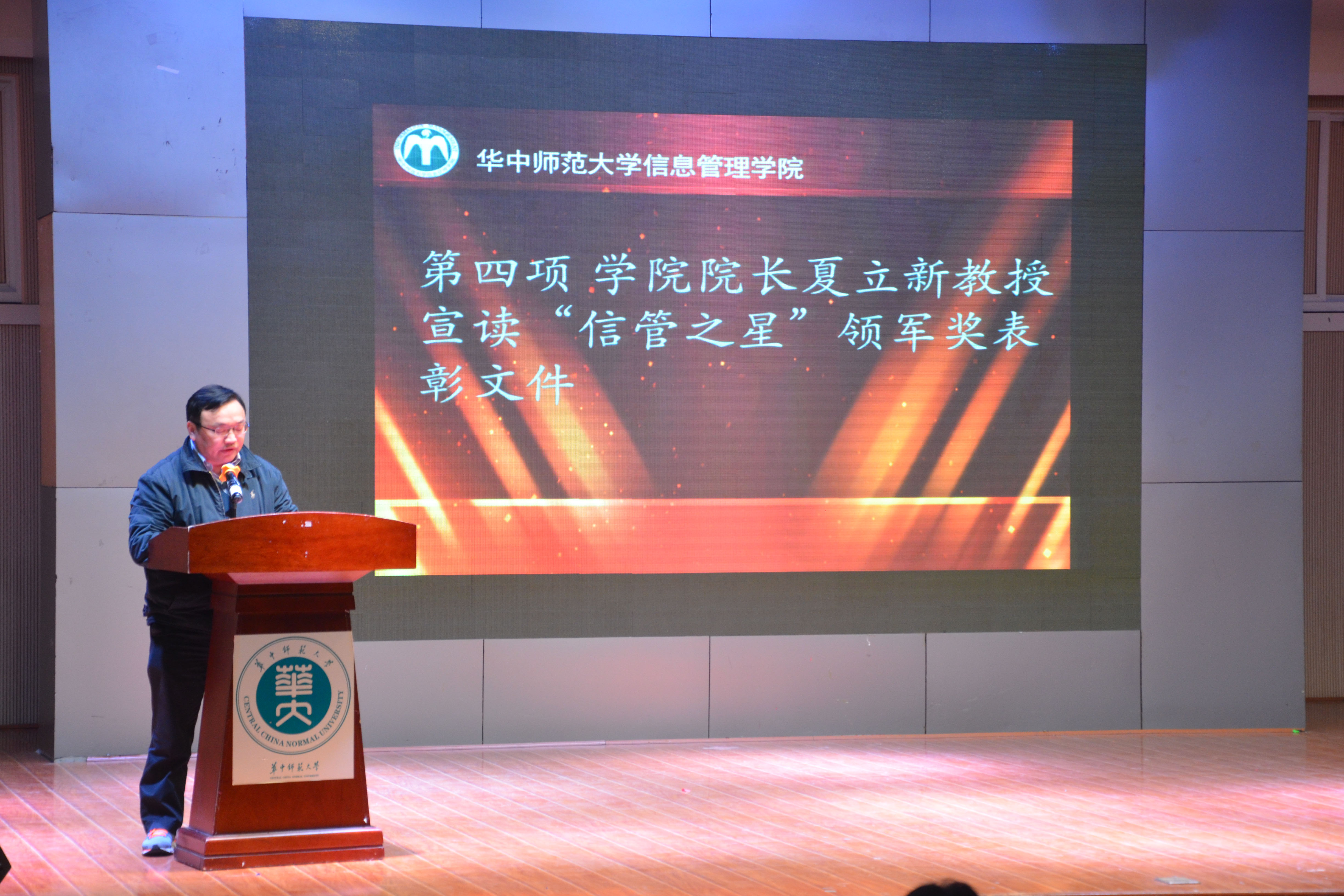 (通讯员 计康凌 宋浩冉)2017年1月6日上午9点,信息管理学院2016年度“信管之星”领军奖表彰大会在大学生活动中心5楼顺利举行。我院自筹资金4.4万对2016年度在学术、创业、体育、学生工作、志愿服务、社团活动等方面有突出表现的个人和团队进行表彰。出席本次活动的嘉宾有校党委副书记覃红教授、学生就业工作处处长王茂胜教授、校团委书记杨臣、学工部副部长李刁、研究生院综合处副处长张舜合作办副主任郭庆、学院党委书记刘宝卿、院长夏立新教授、副院长卢新元教授、副院长李延晖教授、院友基金会副理事长王战平教授及学院各位教师,大会由学院党委副书记杨青松主持。