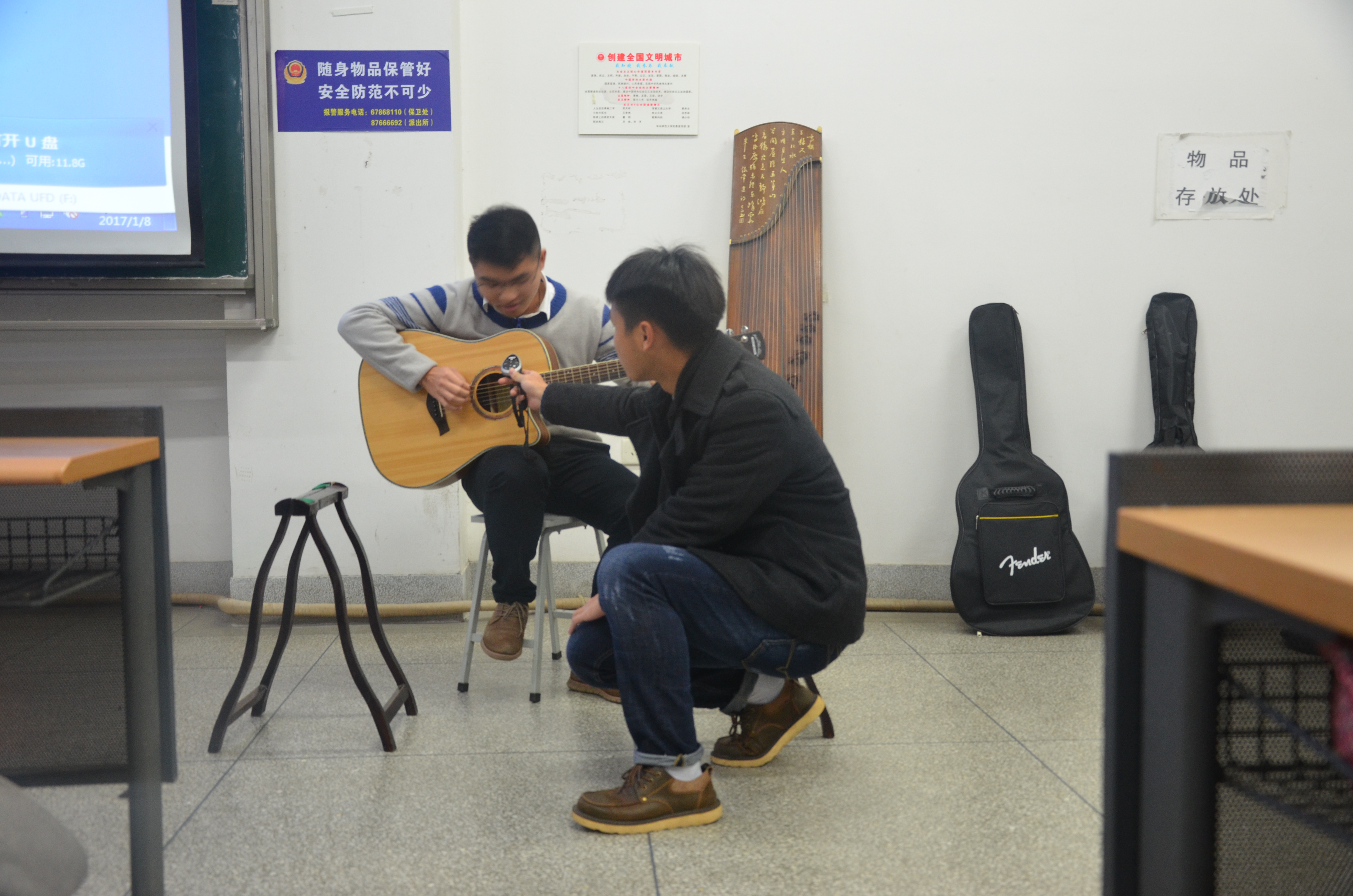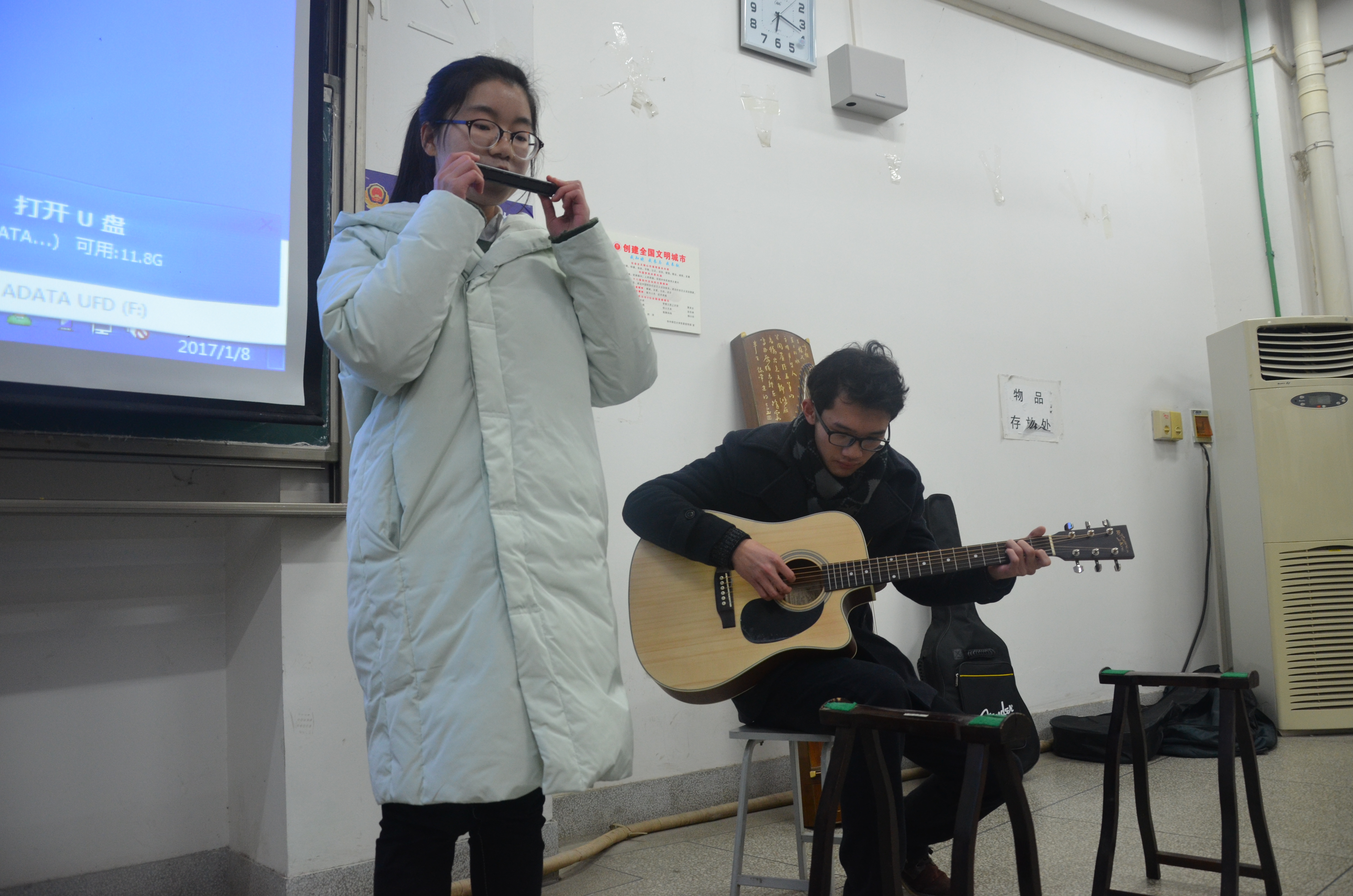 接下来的同学们带来了乐器表演,徐欣媛和谭承林同学带来了口琴与吉他的乐器合奏《送别》。最后表演的刘念夷同学则带来了古筝独奏,以其出色的手法、长时间不间断的弹奏方式给全场的人带来了一场视听盛宴。