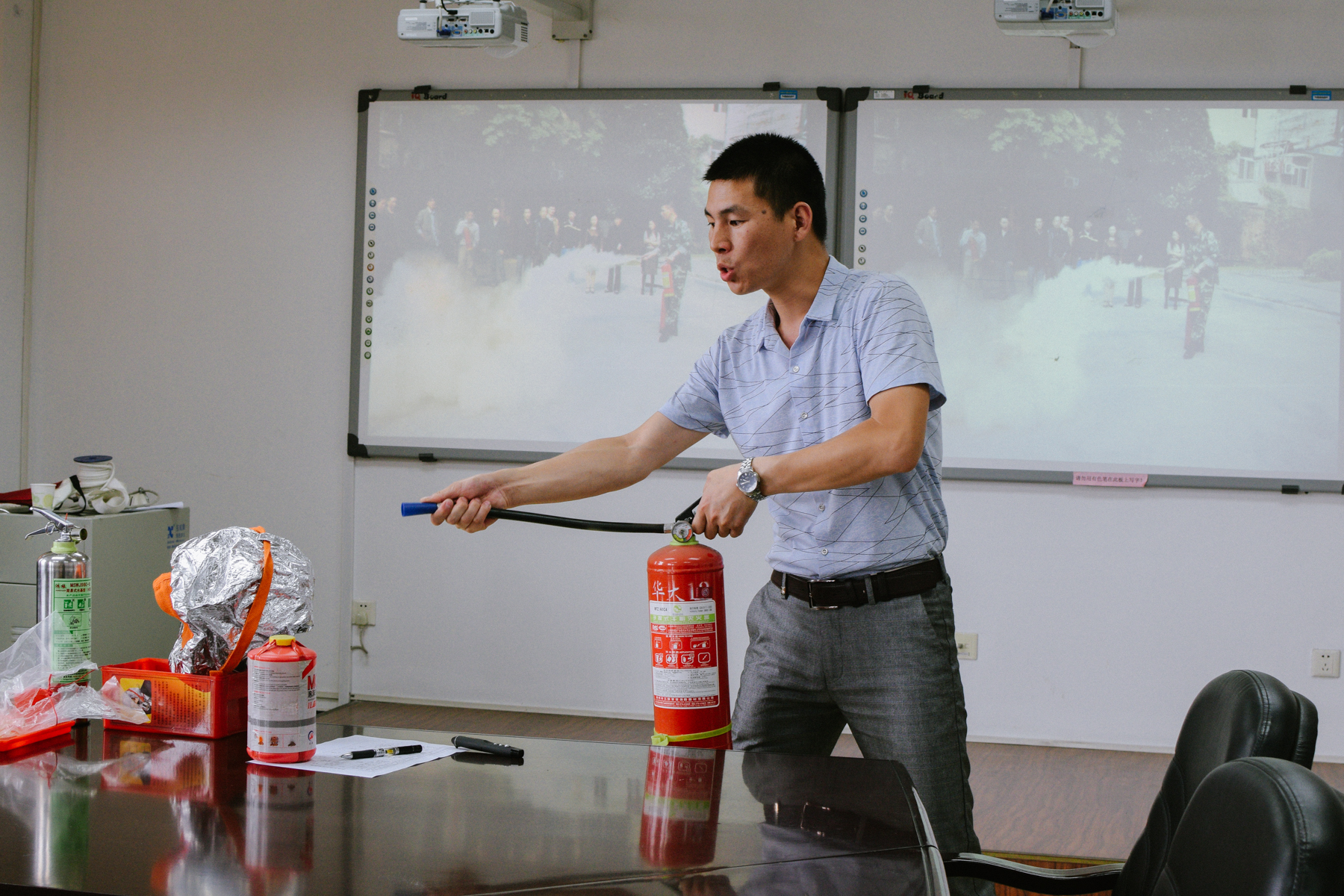 此外,欧阳教官划分了不同的情形,向大家普及了火场求生方法以及消防器械的相关知识,并带来了防毒面具、灭火器、救生绳索等实物,向大家展示了消防器械的使用方法。比如,在城市楼房中,尤其要留意疏散通道、指示标志灯的布局;在校内,老师格外要肩负起维持现场秩序的责任,以避免踩踏事故;又比如,人在火灾中的死因,往往是浓烟窒息,因此,家家户户按人员数配备防毒面具就十分必要。之后,教官让一位老师配合示范,演示了防毒面具的佩戴方法,指出其过滤强,耐高温等优点。教官还分别展示了几种不同的专业灭火器,强调在不同的场合,不同类型的灭火器具有更显著的功效。