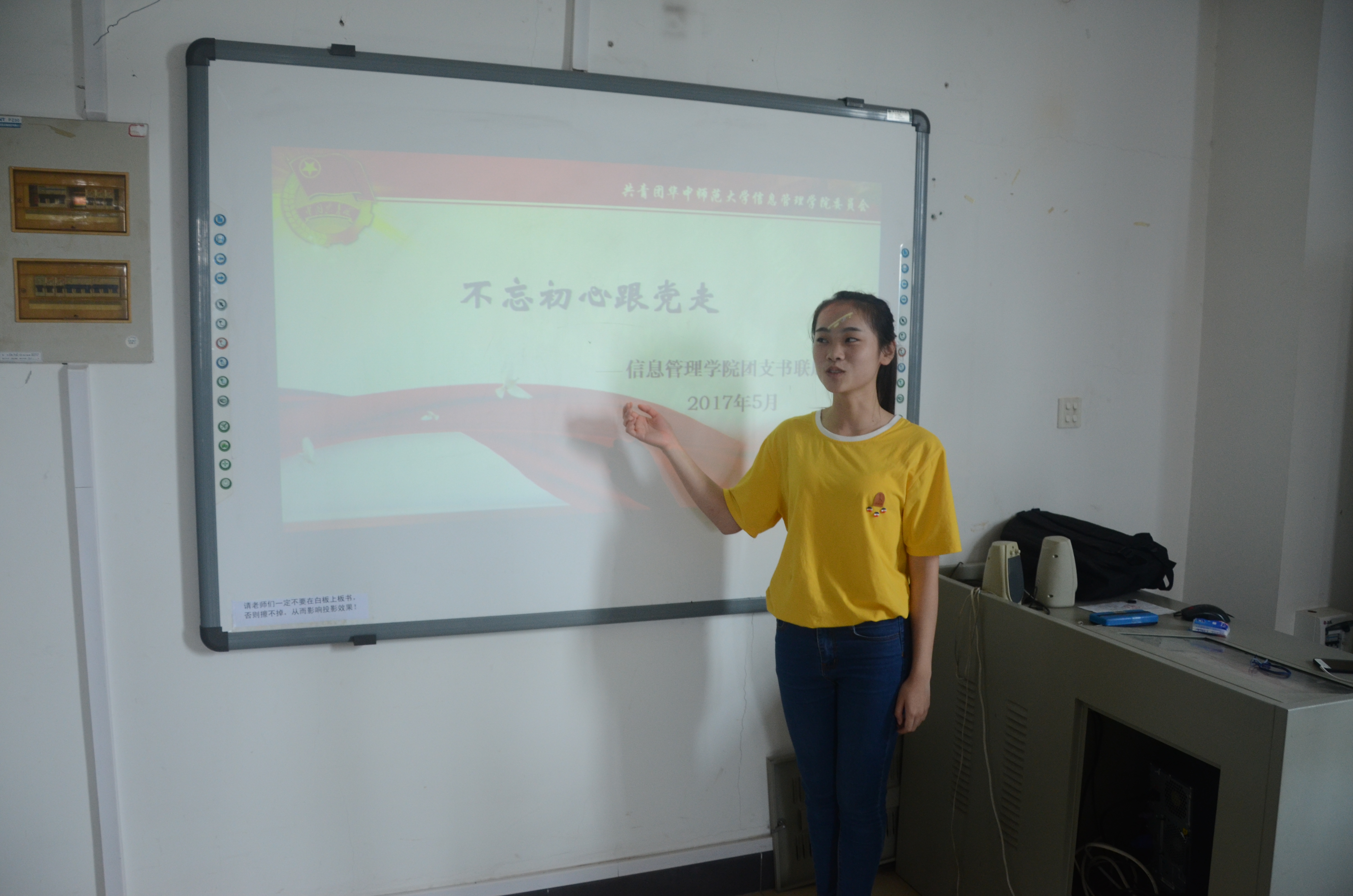 会议之初,为积极响应五四号召,落实全团关于“学习总书记讲话,做合格共青团员”教育实践的总体要求,信息管理学院组织部以“不忘初心跟党走”为主题,组织新发展团员参加入团仪式,组织老团员重温入团誓词。全体人员都庄严宣誓,声音洪亮。然后新任信息管理学院组织部部长吴逸姝进行自我介绍,表达与组织部共同进步的心情。前组织部部长姚玉佳,新任组织部副部长朱波林与商怿也都相继进行讲话。