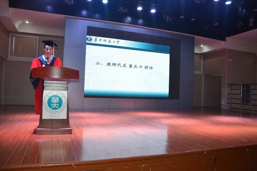 接着,优秀本科毕业生代表苑亚坤、优秀硕士毕业生代表孙晶琼、教师代表董庆兴、家长代表杨立新进行发言。董庆兴副教授从“怎样做一个普通人”的角度给大家分享了三点经验:首先,把积极对待人生作为一种人生理念,包括积极做好事前准备和积极面对不好结果;其次,确立认真严格的工作态度;最后,保持终身学习的学习态度。而家长代表杨立新,则以学生家长和信管院友的双重身份,代表毕业生家长对学院表示感谢,他希望所有的毕业生都能牢记父母的养育之恩、桂子山的培育之情、青葱岁月的同学之谊。