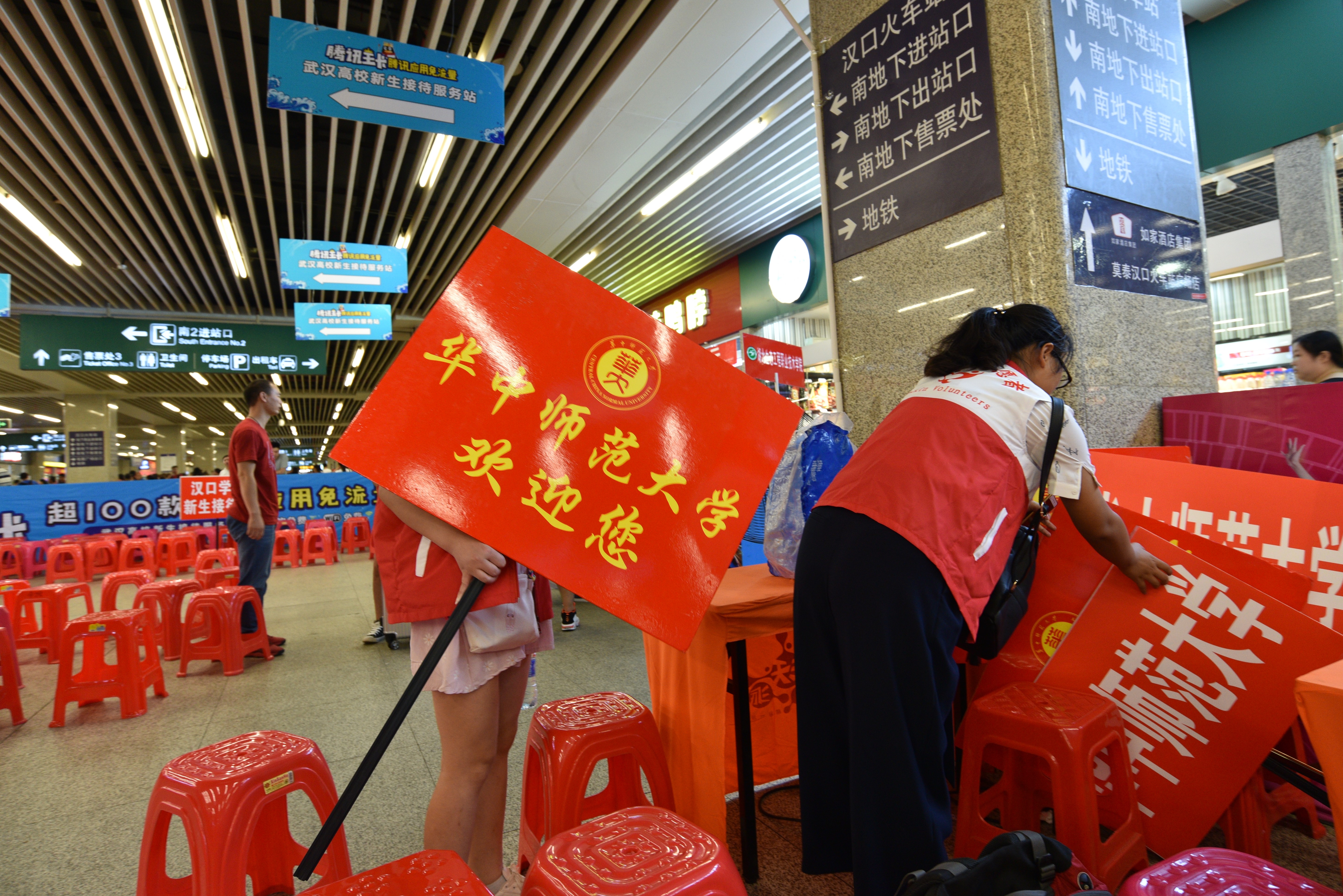 在汉口火车站,志愿者和工作人员早早的布置好休息区,设置好校旗和迎新牌子,一切井然有序等待新生到来。随着列车车次的不断驶入,一批又一批的人员流动加上火车站人员复杂,这些都给志愿者的工作带来了干扰。由里到外,近一百米一个牌位,新生走出车站全程有志愿者陪同。在出站口的几名志愿者举着牌子指引新生,确认身份后,在由志愿者带领下前往休息处。核对报备好身份信息后,志愿者便安排新生及其陪同家长就坐,随着来临人数的增多,志愿者也不断地添搬椅子,并倒送茶水以缓解新生和家长的旅途劳累。