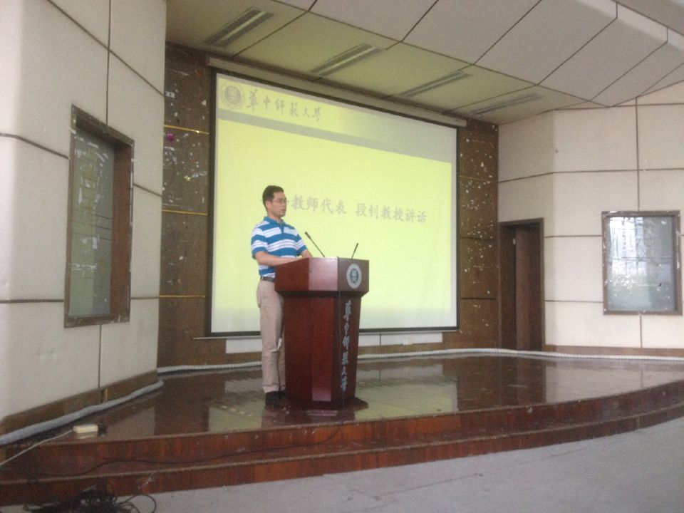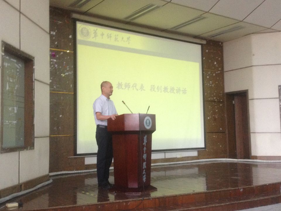 最后,教师代表段钊教授发言,他对新生们选择继续深造学习表示高度的赞赏,也对新生们提出了“怀有理想、不断学习、开阔视野、学术与实践相结合”的要求。他表示,研究生是大家的第一份工作,大家要认真对待,希望新生们能与导师们在互动中共同成长。
