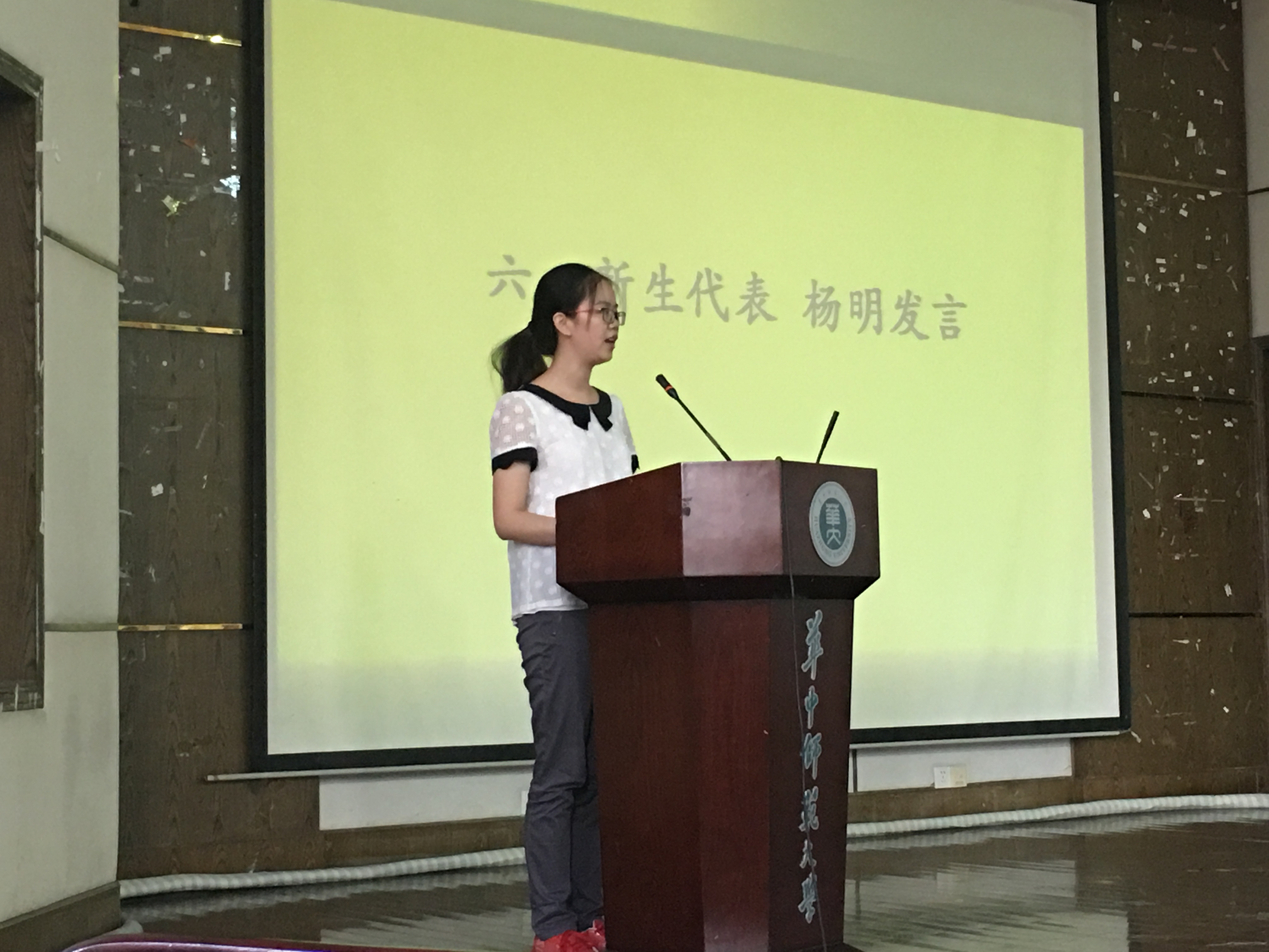 随后,新生代表杨明在发言中表达了新生们对于新学习生活的期待与向往。表示在之后的学习中将认真对待自己的选择,志存高远、脚踏实地,在日常学习生活中积极践行“华师精神”。