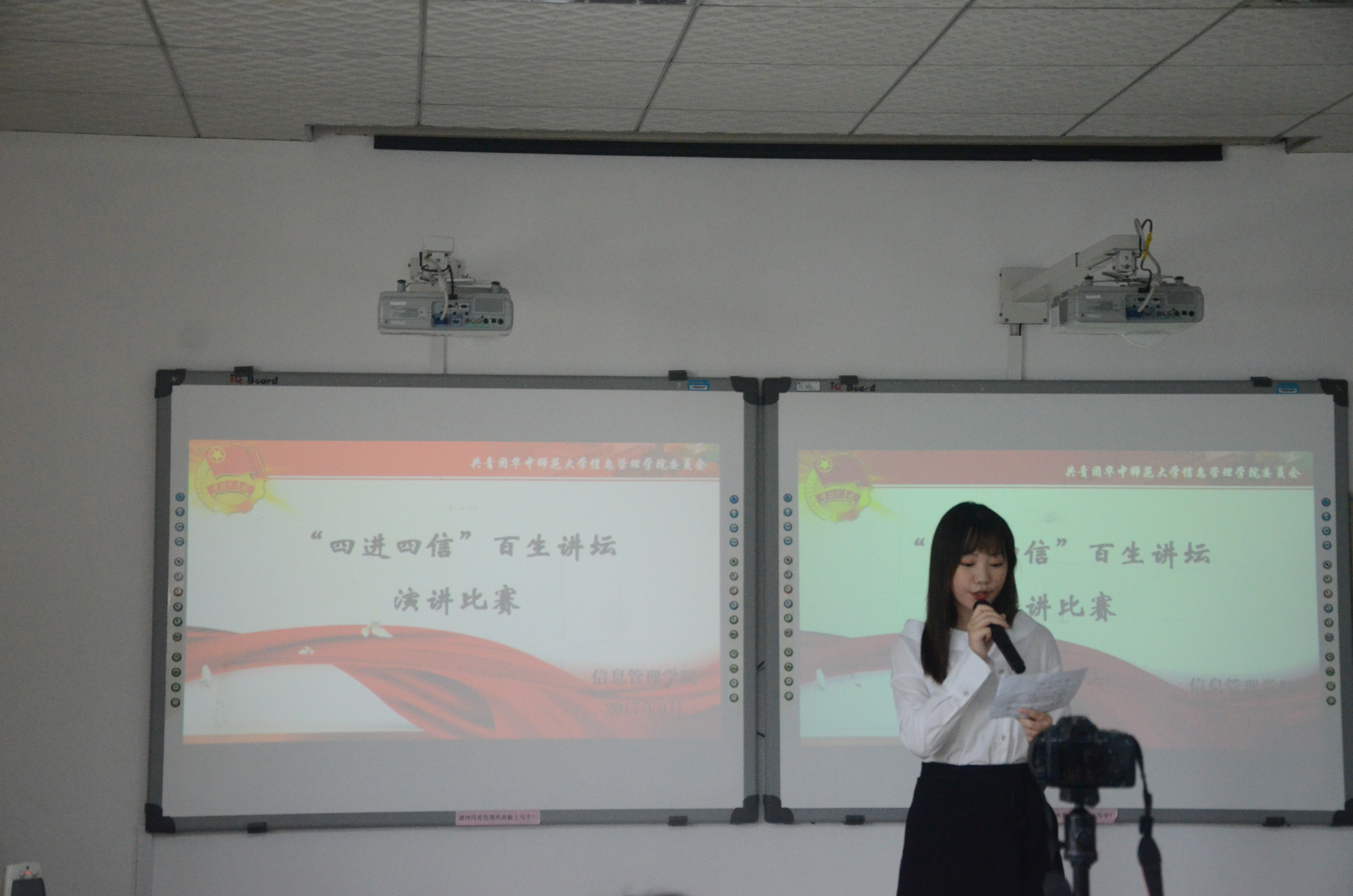 比赛9点准时开始,8位参赛选手分成两组,进行了内容充实,符合主题中心思想的演讲,声情并茂的演讲配上背景音乐、ppt等展现形式使本次演讲活动更为有趣和充满互动性。选手们结合历史史实和自己亲身经历,就“四进四信”的内涵、青年与中国梦的关系进行演讲,充分展现了当代大学生的丰富的精神风貌和对“中国梦”的深入思考。