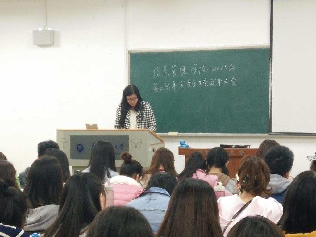 10月15日晚上七点,信息管理学院2015级在8303教室进行了晚点名和年级学生会述职报告。点名和报告由辅导员蒋可鸣主持,15级全体学生参与。