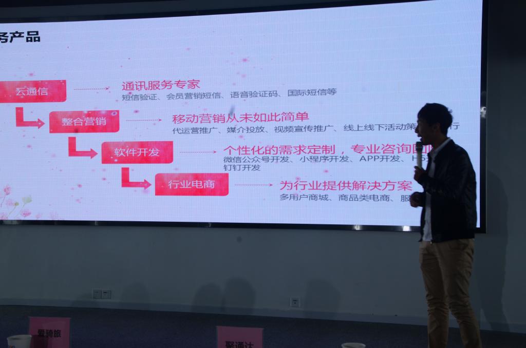 随后是各个企业的产品宣讲环节。闲转、爱骑旅、点指文化等让同学们对电子商务有了更具体化的认知。聚通达楚云科技有限公司的代表任彦雄讲到了自己一年连升工作经历。基层做起,不断突破,这是任总监教给同学们的经验。