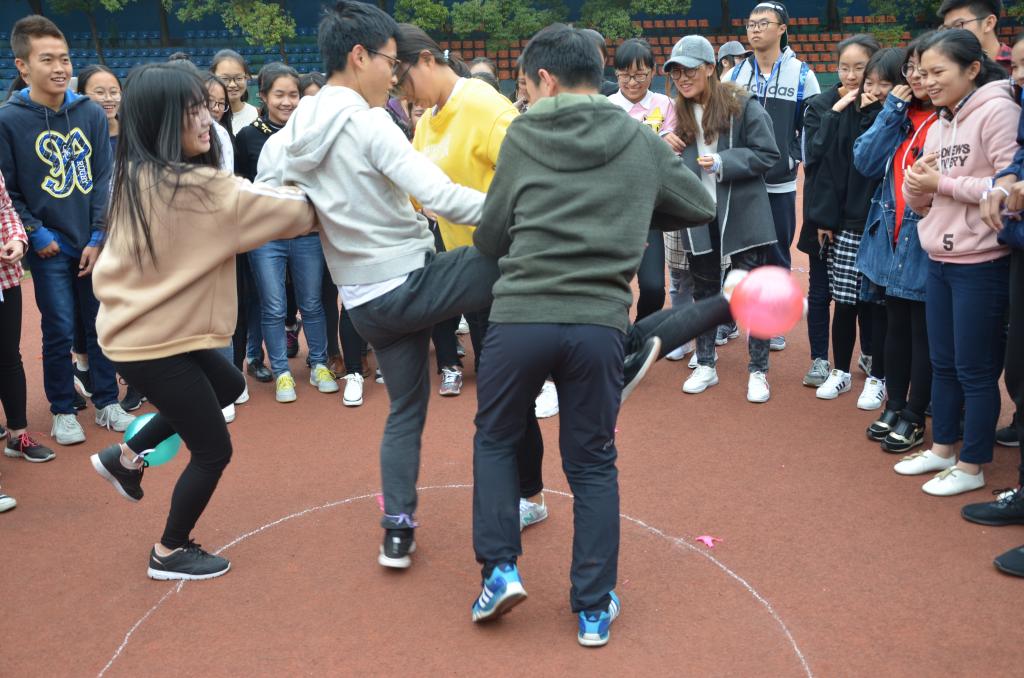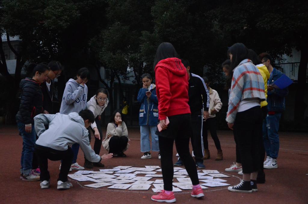 首先大家以小组为单位散开,进行第一项气球大战。每一位同学脚踝上绑着一个气球,在自己保护好自己的气球的同时要想尽办法踩爆别人的气球,先是在小组中决出两名胜者,两人代表自己组和其他小组的胜出者进行终极对决。终极比赛要求每一组的两个人双手绑在一起,只有一个人的脚踝上有气球,另一个人负责保护该同学。这是一个考验大家协作能力的游戏,同时也很好地激发出同学们对此次活动的热情。