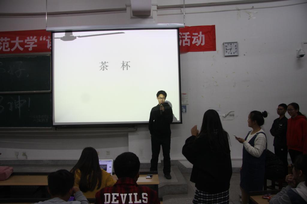晚会开始,首先是紧张有趣的游戏环节。第一项游戏为你划我猜,第一轮参加游戏的同学为运动会中猪八戒背媳妇趣味项目的各组搭档们,所猜词语在贴近生活的同时又富有一定的文化气息,例如,笔墨纸砚,孙悟空,梅花等词语的出现着实增添了游戏的内涵。第一小组上场的徐亮与武晓红一开局就展现了极高的默契程度,杨碧玉与陈思伟后来居上,答出了十四组词语的好成绩并成功成为本组冠军组。