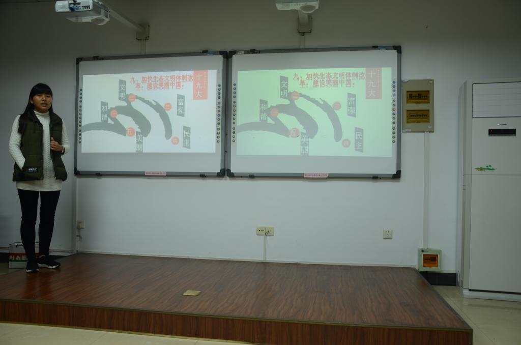 作为大学生,不仅仅要自我发展,更应顺应时代的步伐,关心祖国的未来。接下来王海燕为大家介绍了十九大的主要思想,在她的演讲之中我们学到社会主义核心主义价值观不只是口号而已,那是我们当代大学生要奋斗的目标,也是我们前行道路上的标杆。演讲结束后,根据演讲内容,进行了有奖竞答,大家在积极回答问题,热情高涨。